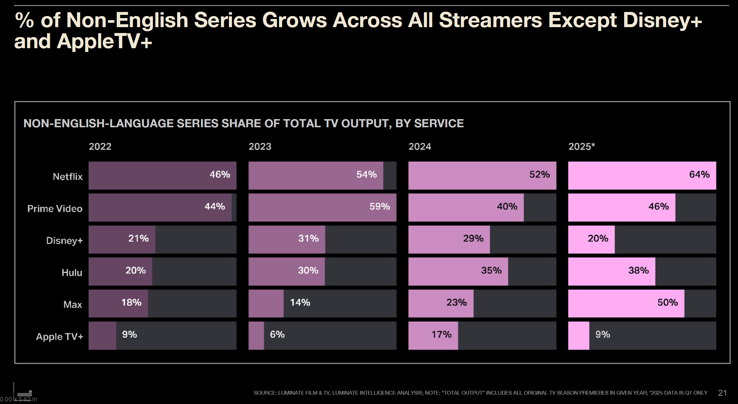 Nearly all major platforms—Prime Video, Disney+, Hulu, Max, Apple TV+—increased their non-English title ratios between 2024 and 2025. The only exceptions were Disney+ and Apple TV+, which Luminate attributed to their current strategies, with future changes remaining possible.