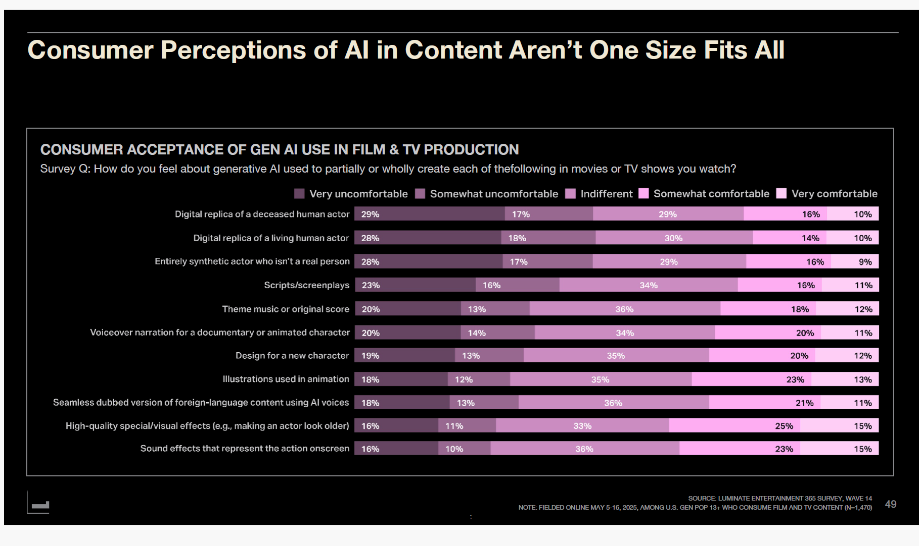 결론적으로, 소비자들은 "비하인드 더 신" 용도, 즉 시각 효과와 사운드에서의 AI 사용에는 가장 편안함을 느끼지만, 인간 배우를 대체하는 것에는 가장 불편함을 느낀다.