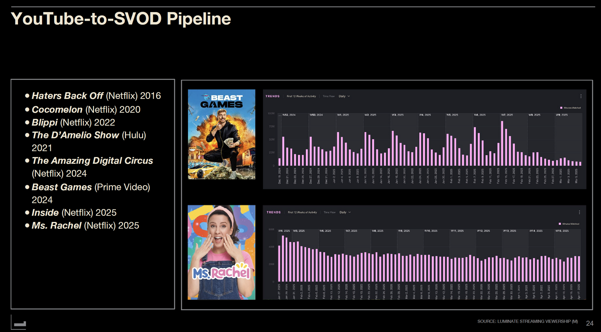 Weekly viewing data for "Beast Games" and "Ms. Rachel" shows both programs maintained stable viewership during their first 12 weeks, demonstrating existing YouTube fanbases migrating to SVOD.