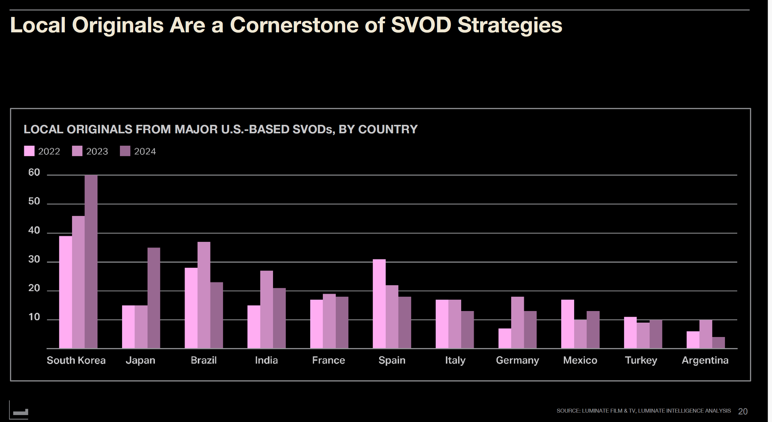 Data also reveals interesting facts. While Korea and Japan show notable increases in local originals, 2024 also saw significant growth from Mexico and Turkey. France is the EU country supplying the most local originals to U.S. SVOD, with titles like "Légende" and "Disparu à jamais."