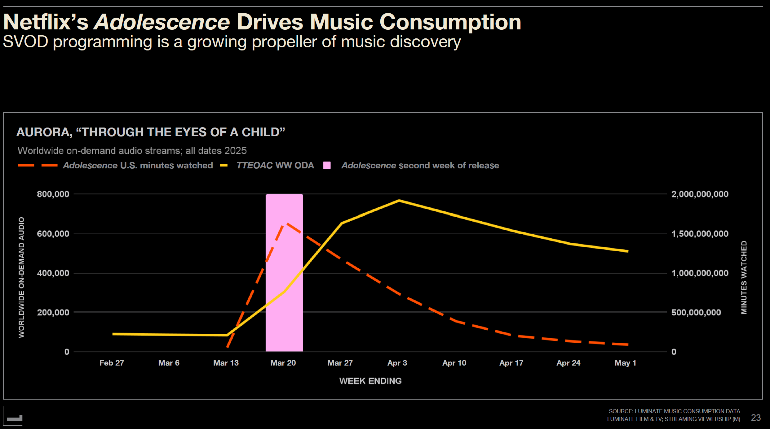 첫 번째 사례는 넷플릭스의 '어돌레슨스'다. 이 영국 시리즈는 두 번째 주에 전형적인 넷플릭스 빈지 패턴(급속한 하락)을 보였다. 그러나 극 중 마지막 에피소드에 삽입된 오로라(AURORA)의 'Through the Eyes of a Child'는 완전히 다른 곡선을 그렸다.