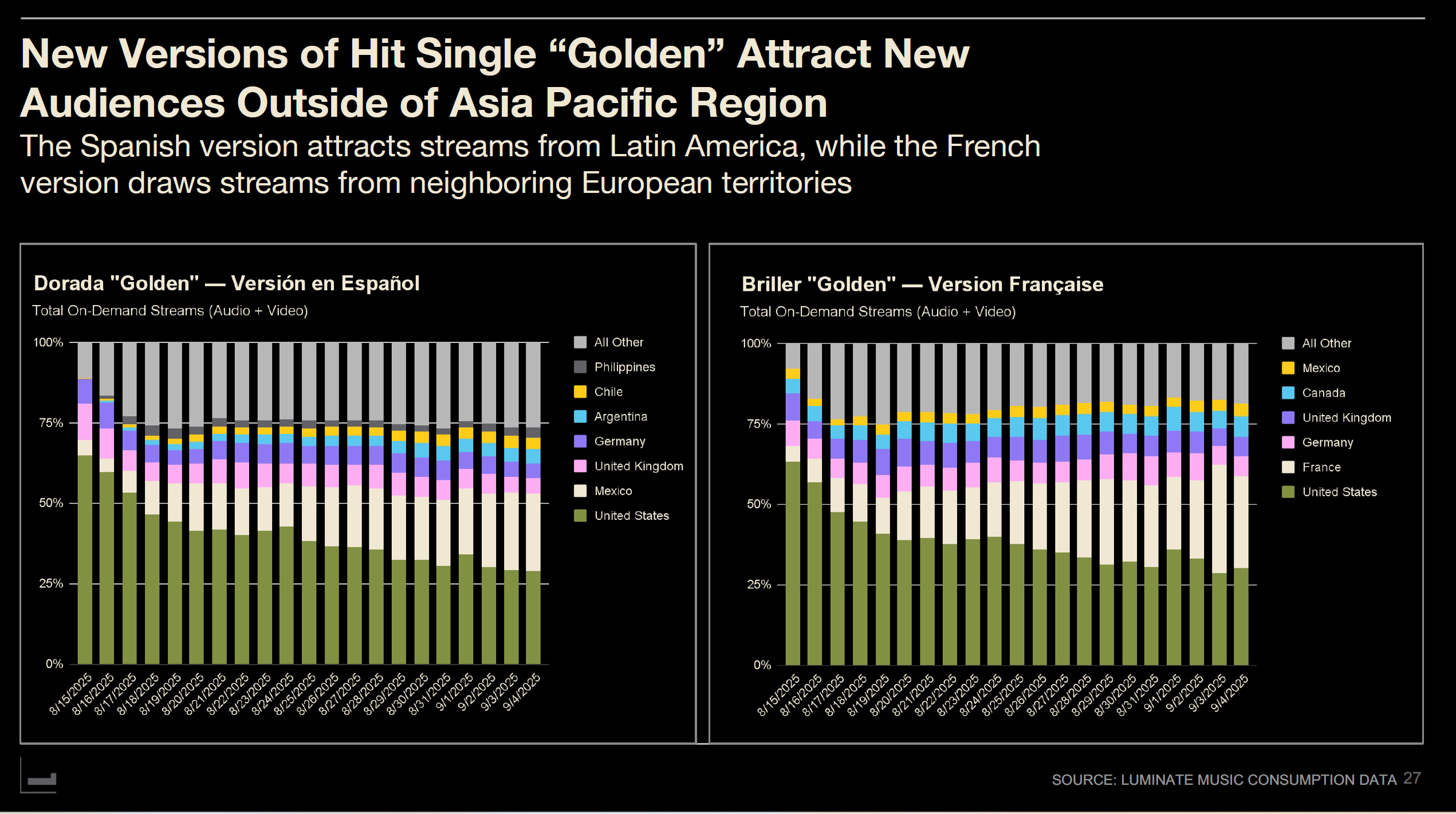 Even more remarkable was the multilingual version success. The film was dubbed into 10 languages, with music also dubbed. Spanish version "Dorado" and French version "Briller" of main track "Golden" each charted independently, each garnering over 5 million global streams separate from the English version.