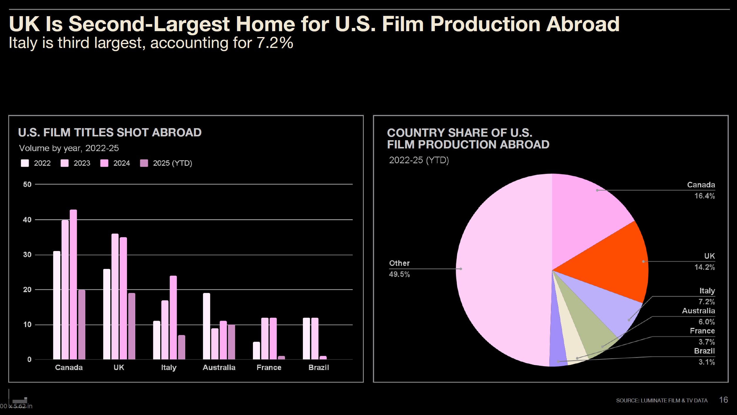Similar patterns emerged in film production. For U.S. films shot overseas, the UK ranked second at 14.2%, after Canada (16.4%). The UK has essentially become the home of period dramas, with most U.S. period pieces like "House of the Dragon," "Outlander," and "His Dark Materials" filmed there.