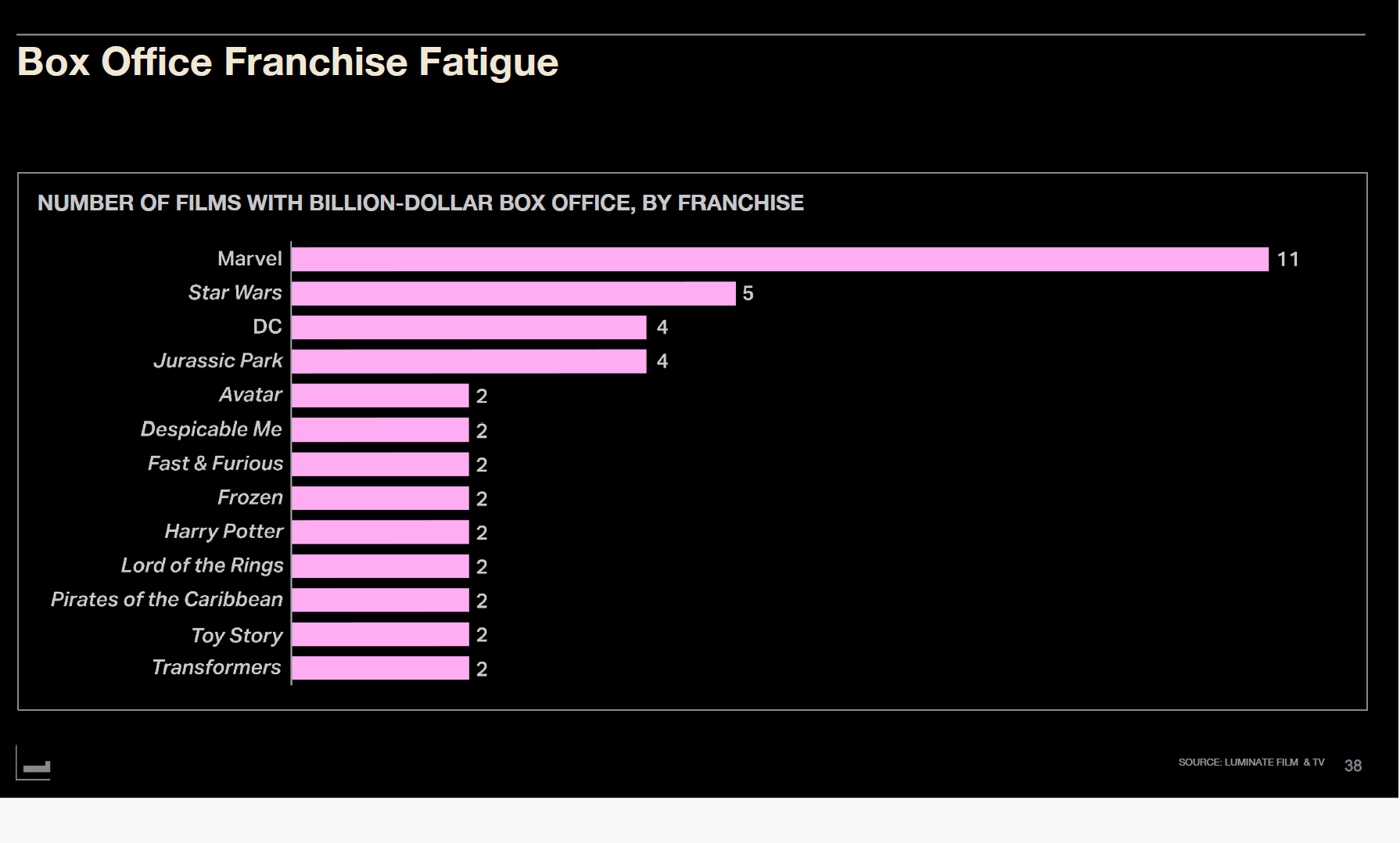 10억 달러 이상 박스오피스를 기록한 프랜차이즈를 보면, 마블이 11편으로 압도적이다. 스타워즈 5편, DC 4편, 쥬라기 공원 4편이 뒤를 잇는다. 아바타, 디스피커블 미, 분노의 질주, 겨울왕국, 해리포터, 반지의 제왕, 캐리비안의 해적, 토이 스토리, 트랜스포머가 각각 2편씩 10억 달러 클럽에 들어갔다.