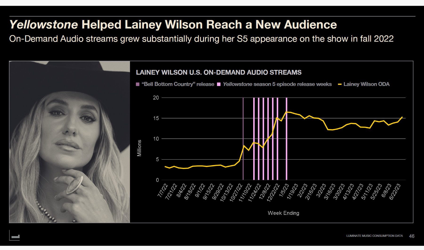 웨스턴 라이프스타일은 음악과도 연결된다. 컨트리 가수이자 배우인 레이니 윌슨은 '옐로스톤' 시즌5에 출연했다. 그래프는 2022년 '옐로스톤' 시즌5 방영(11월~12월)과 관련된 레이니 윌슨의 미국 온디맨드 오디오 스트림을 보여준다.