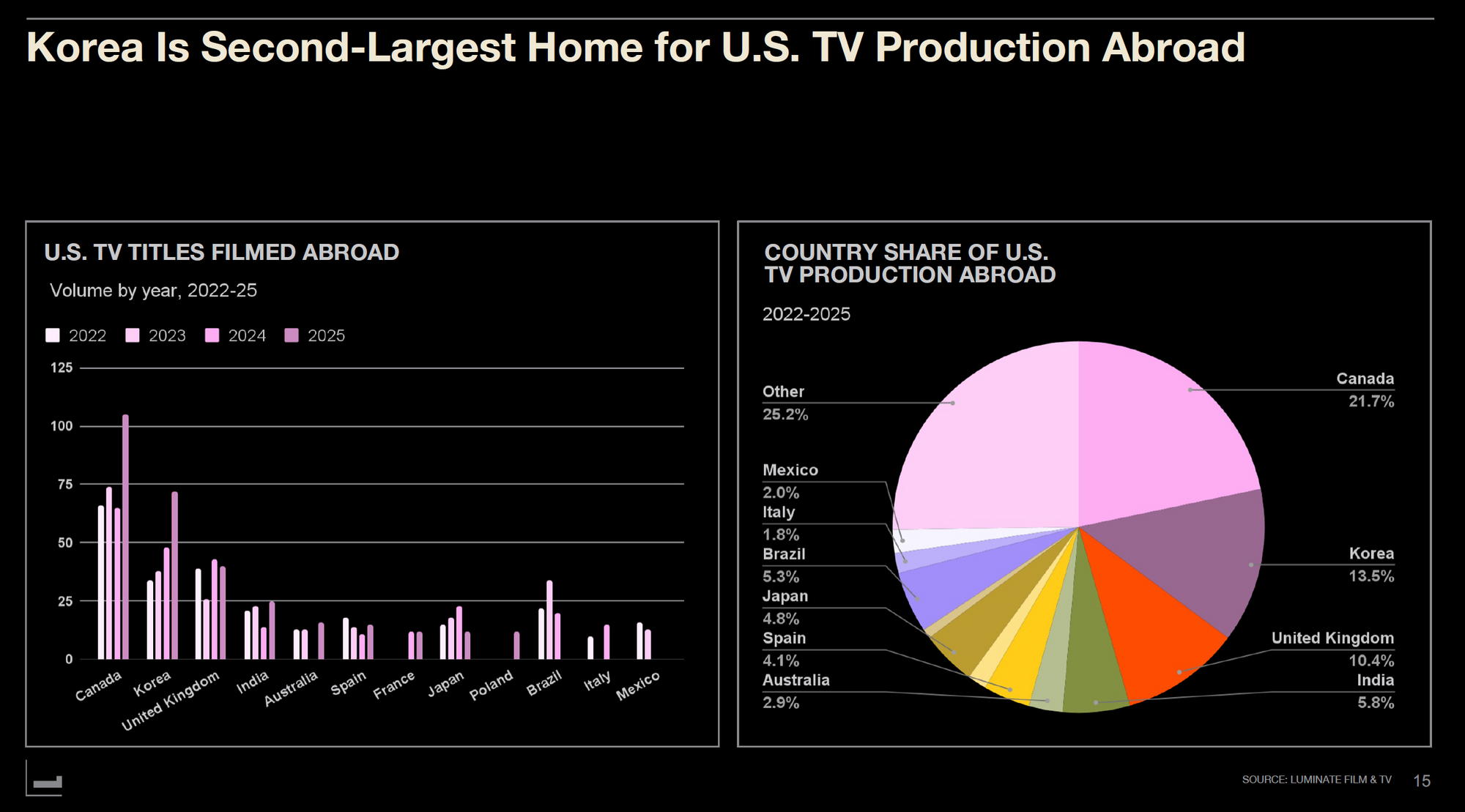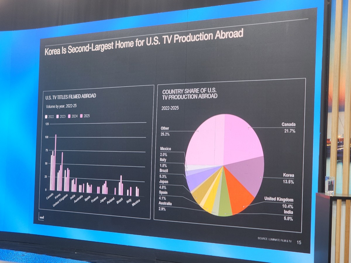 Mark Hoebich, Executive Vice President of Luminate from Los Angeles, stated firmly as heads nodded throughout the audience. The screen displayed clear figures: from 2022 to 2025, Korea captured 13.5% of overseas production locations for U.S. TV programs, ranking second only to Canada (21.7%). Korea surpassed the UK (10.4%) and India (5.8%) to become a bona fide global production hub.