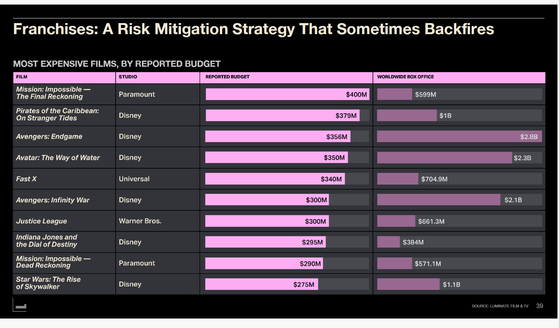 그러나 프랜차이즈 전략에는 리스크도 있다. 가장 비싼 영화 톱10을 보면, 대부분이 프랜차이즈 작품인데 박스오피스 성과는 엇갈렸다.
