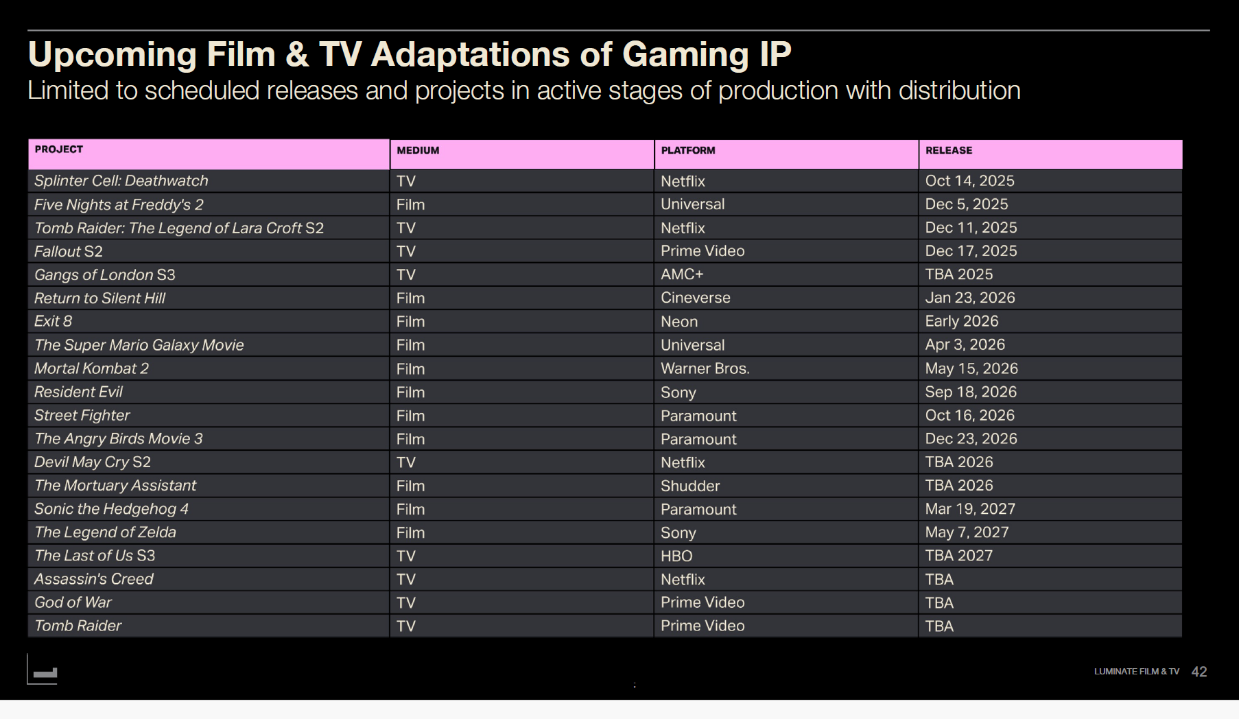 Major gaming IP scheduled for 2025–2027 or in active production includes: "Splinter Cell: Deathwatch" (TV, Netflix, Oct 14, 2025), "Five Nights at Freddy's 2" (Film, Universal, Dec 5, 2025), "Tomb Raider: The Legend of Lara Croft Season 2" (TV, Netflix, Dec 11, 2025), "Fallout Season 2" (TV, Prime Video, Dec 17, 2025), "Gangs of London Season 3" (TV, AMC+, 2025), "Return to Silent Hill" (Film, Cineverse, Jan 23, 2026), "Exit 8" (Film, Neon, early 2026), "Super Mario Galaxy Movie" (Film, Universal, Apr 3, 2026), "Mortal Kombat 2" (Film, Warner Bros, May 15, 2026), "Resident Evil" (Film, Sony, Sep 18, 2026), "Street Fighter" (Film, Paramount, Oct 16, 2026), "Angry Birds Movie 3" (Film, Paramount, Dec 23, 2026), "Devil May Cry Season 2" (TV, Netflix, 2026), "Mortuary Assistant" (Film, Shudder, 2026), "Sonic the Hedgehog 4" (Film, Paramount, Mar 19, 2027), "The Legend of Zelda" (Film, Sony, May 7, 2027), "The Last of Us Season 3" (TV, HBO, 2027), "Assassin's Creed" (TV, Netflix, TBA), "God of War" (TV, Prime Video, TBA), "Tomb Raider" (TV, Prime Video, TBA).
