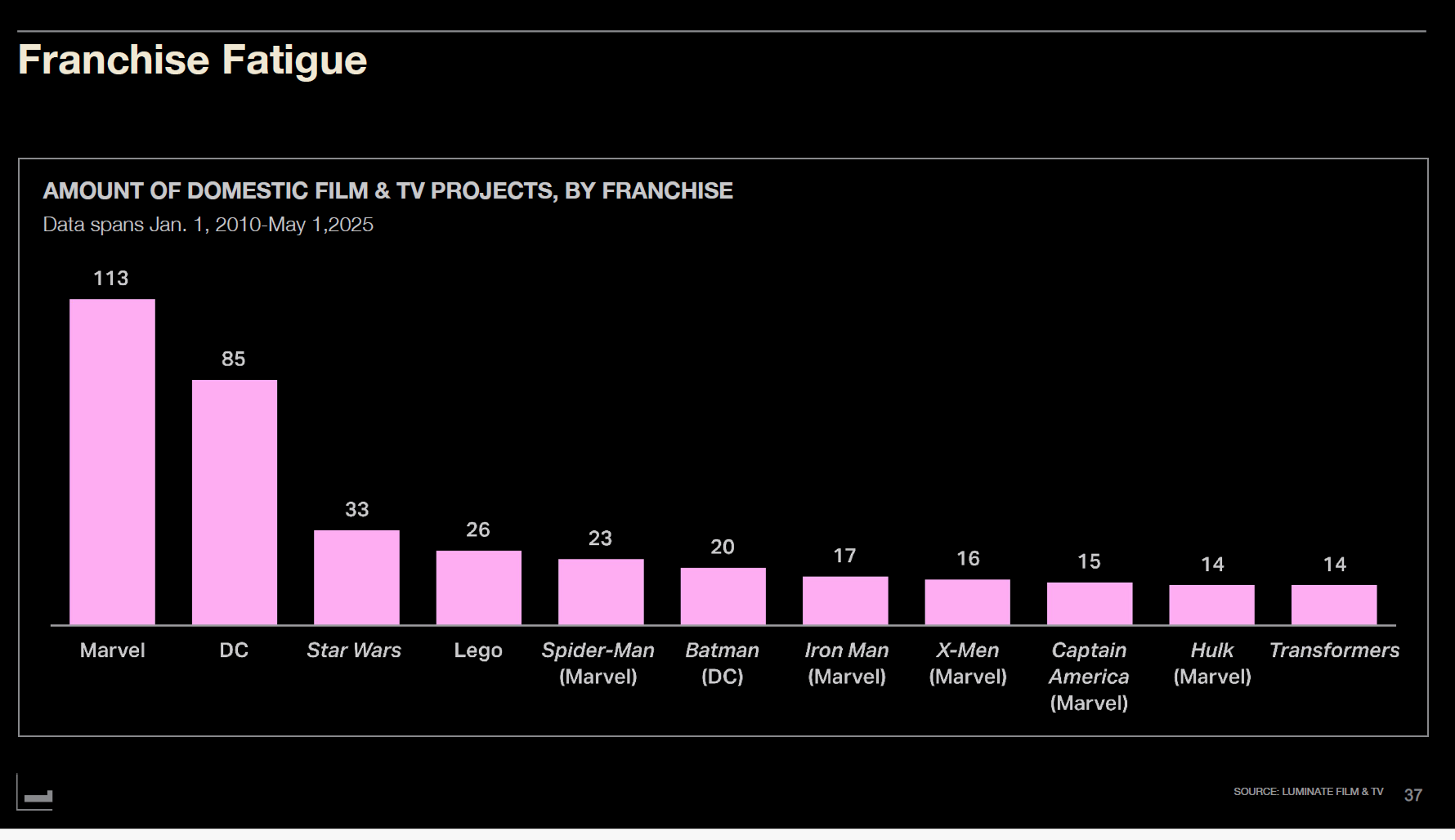 2010~2025년 영화와 TV의 프랜차이즈별 프로젝트 수를 보면, 마블이 113편으로 압도적 1위다. DC가 85편으로 2위, 스타워즈가 33편으로 3위다. 레고(26편), 스파이더맨/마블(23편), 배트맨/DC(20편), 아이언맨/마블(17편), 엑스맨/마블(16편), 캡틴 아메리카/마블(15편), 헐크/마블(14편), 트랜스포머(14편)가 뒤를 잇는다.