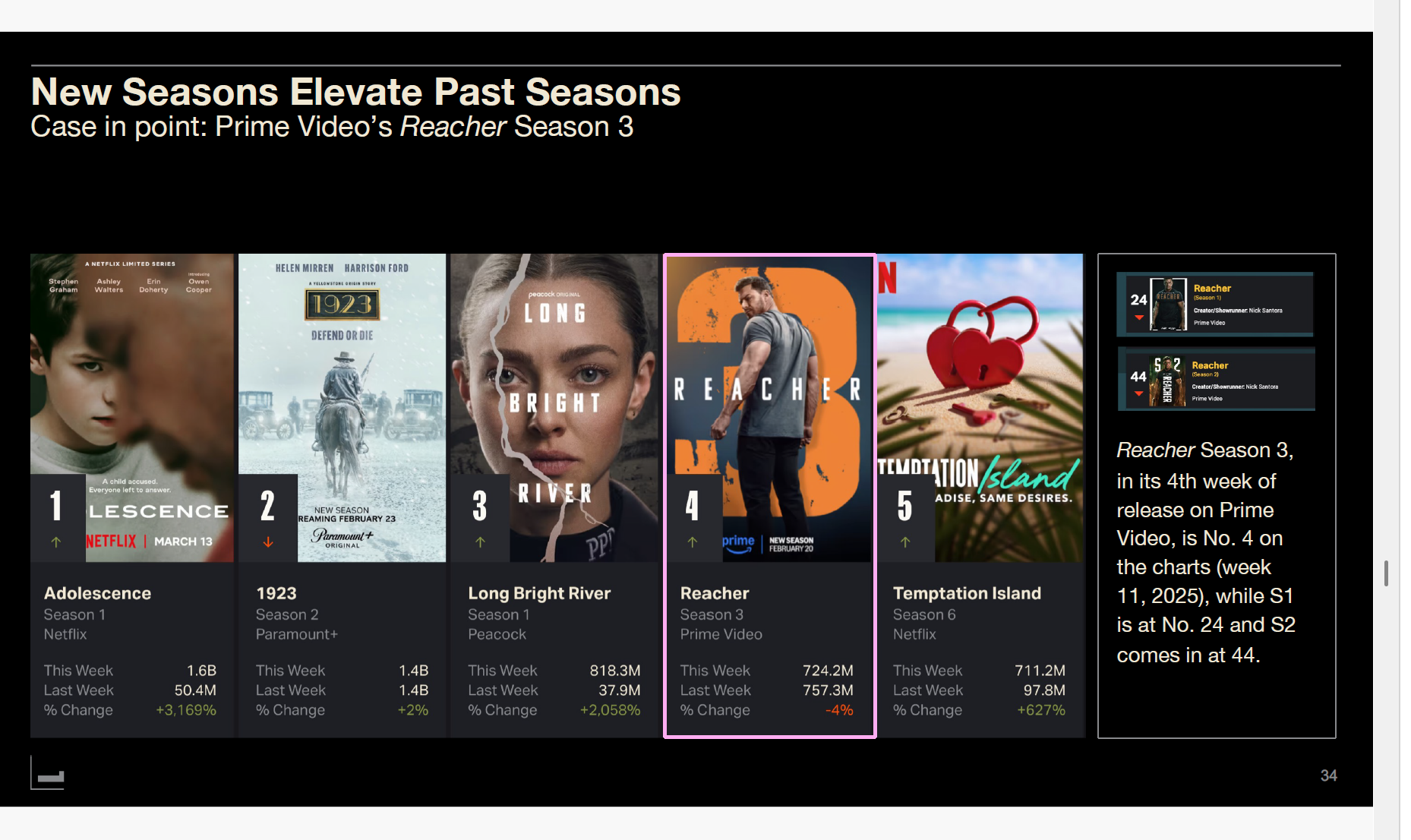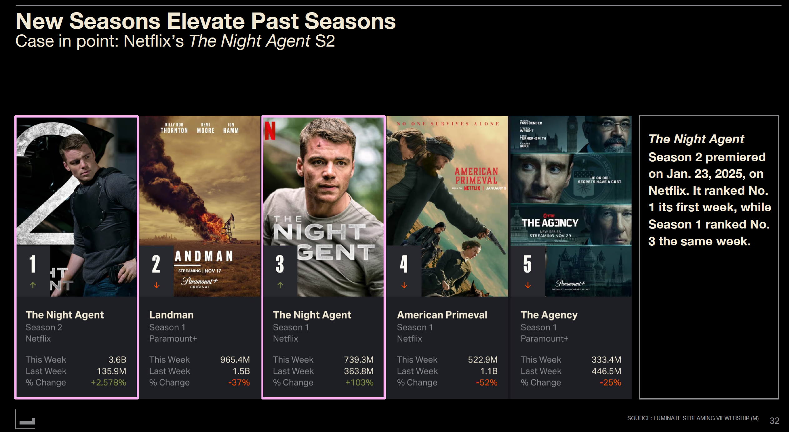 Netflix's "The Night Agent" followed suit. Season 2 premiered January 23, 2025, taking first place in its first week, while Season 1 simultaneously reached third. This pattern repeatedly appears in "Reacher," "Severance," "Foundation," and others.