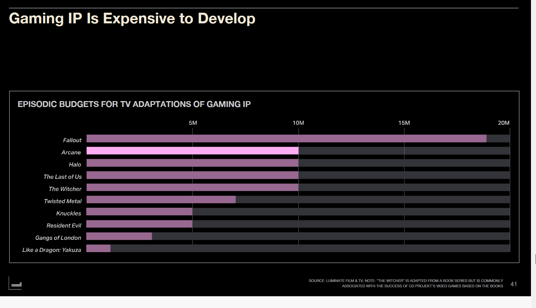 Gaming IP is more expensive for TV than film. Amazon Prime Video's "Fallout" cost approximately $20M per episode—double HBO/HBO Max's already expensive "The Last of Us." Even Netflix's animated "Arcane" cost $10M per episode, matching "The Last of Us."
