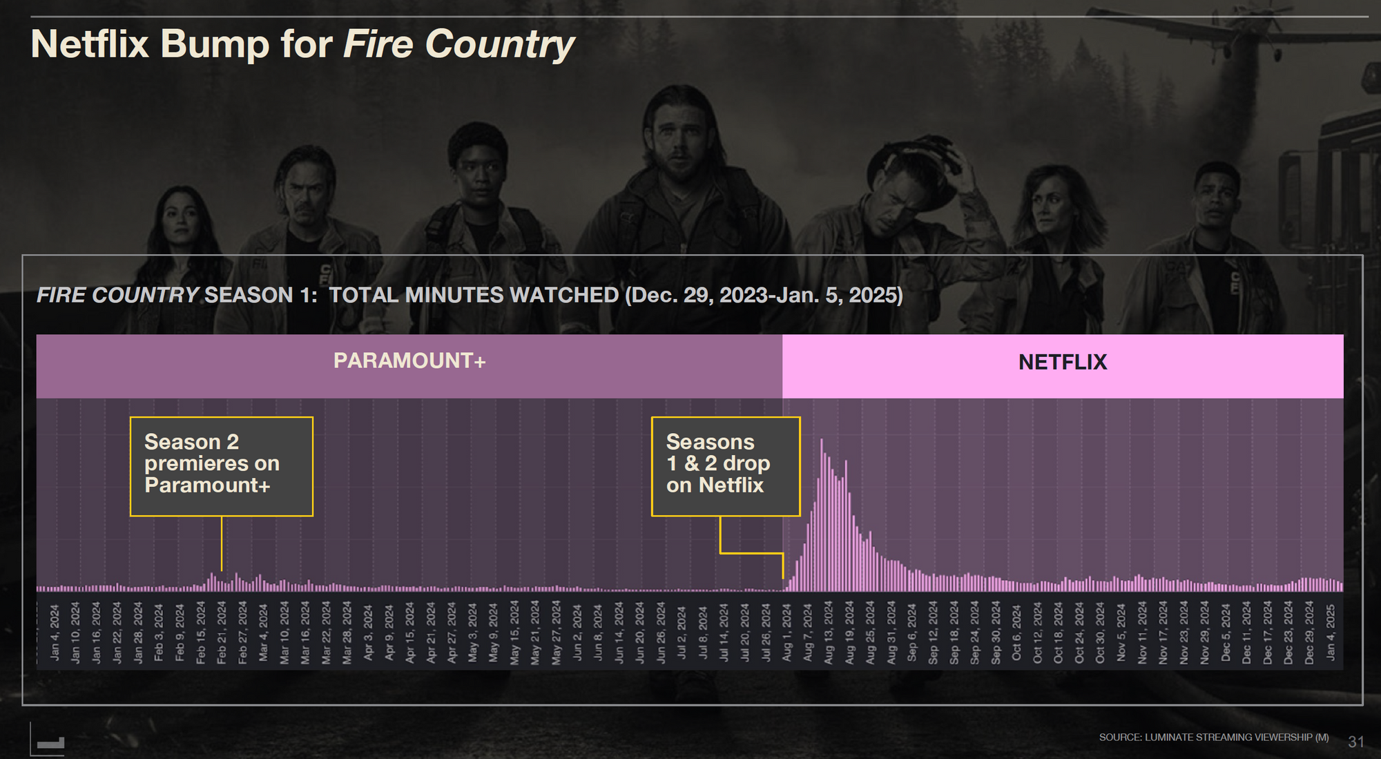 Another case is CBS's "Fire Country." After Season 2 premiered on Paramount+ on February 17, 2024, the left graph shows a slight spike in Season 1's Paramount+ viewing. Then Seasons 1 and 2 moved to Netflix in August 2024.