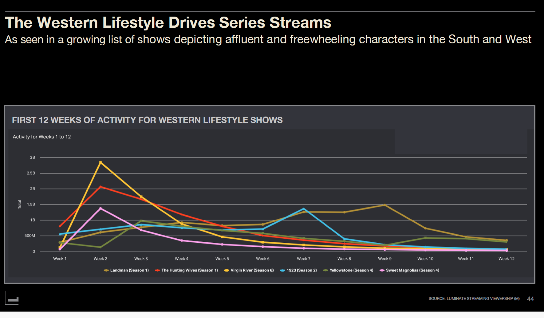 첫 12주간 웨스턴 라이프스타일 시리즈의 성과를 보면, 넷플릭스의 '랜드맨' 시즌1이 압도적이다. 2주차에 30억 분 가까이 시청되며 정점을 찍었다. 넷플릭스의 '더 헌팅 와이브스' 시즌1이 2위, '버진 리버' 시즌6가 3위를 기록했다. 패러마운트+의 '1923' 시즌2, 피콕의 '옐로스톤' 시즌4, 넷플릭스의 '스위트 매그놀리아스' 시즌4도 상당한 시청률을 기록했다.