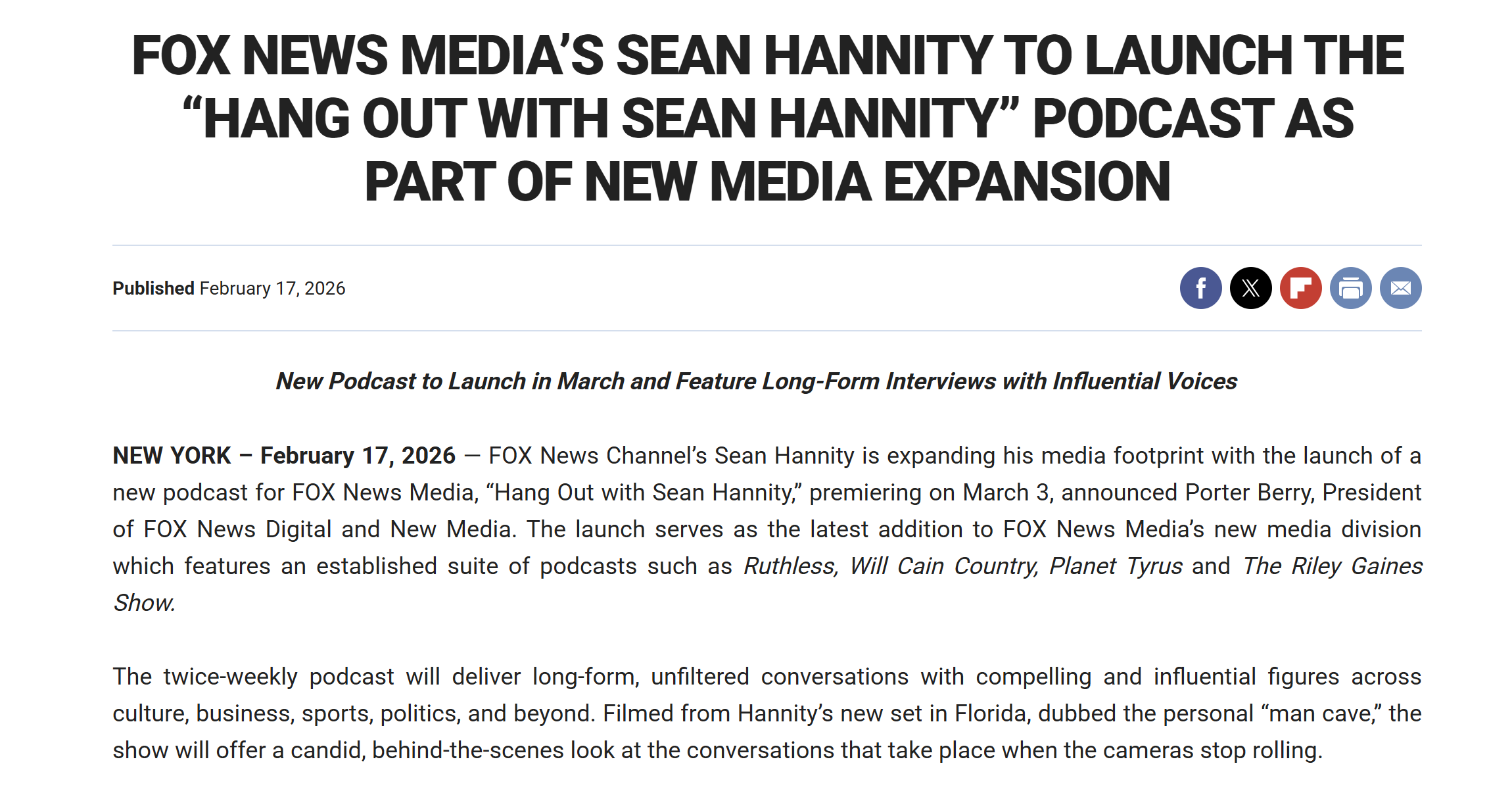 [2] Todd Spangler, "Fox News' Sean Hannity Is Launching a 'Hang Out' Podcast From His Man Cave in Florida," Variety, February 17, 2026.