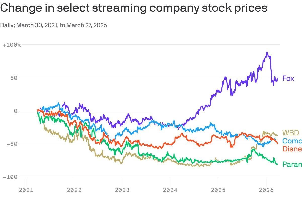 아래 차트는 지난 5년간(2021~2026년 3월) 주요 스트리밍 관련 기업의 주가 변동을 보여준다. WBD, Comcast, Disney, Paramount 모두 –30%에서 –70% 구간에 머물러 있는 반면, Fox만 유일하게 +50%를 상회하는 상승률을 기록했다.