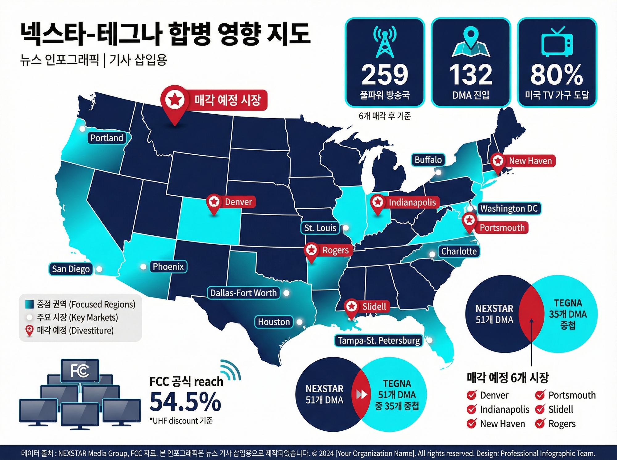 첫째, 넥스타는 2년 안에 6개 방송국을 매각하기로 약속했다. 덴버(KTVD), 인디애나폴리스, 뉴헤이븐 등 일부 중대형 시장을 포함한 6개 채널을 처분해도, 합병 법인은 여전히 44개 주 265개 방송국, 약 80% TV 가구 도달이라는 구조를 유지한다.