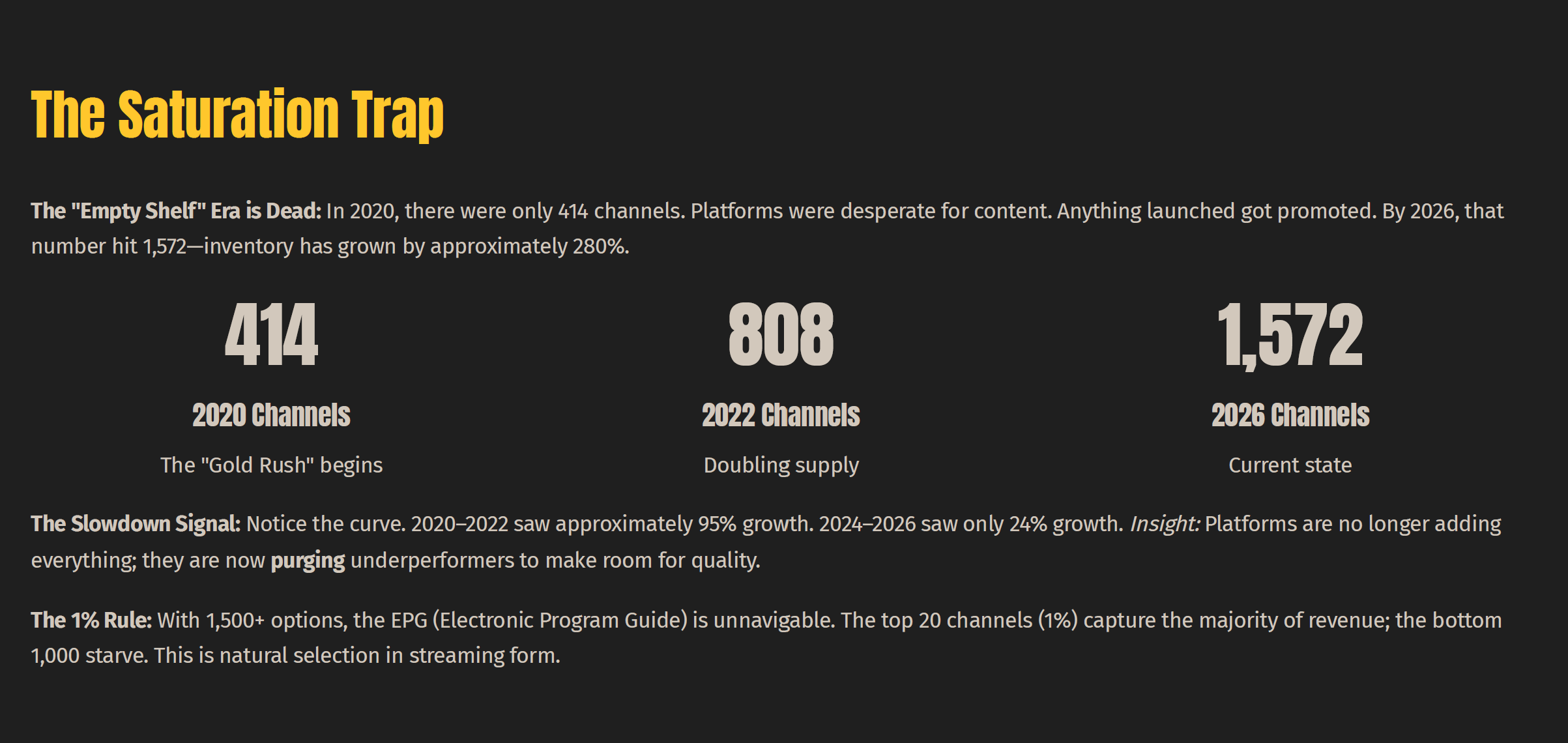 - FAST 채널 수는 2020년 414개에서 2026년 1,572개로 280% 증가했지만, 성장률 둔화와 함께 플랫폼의 “저성과 채널 정리(퍼지)”가 시작된 포화 단계에 진입했습니다.