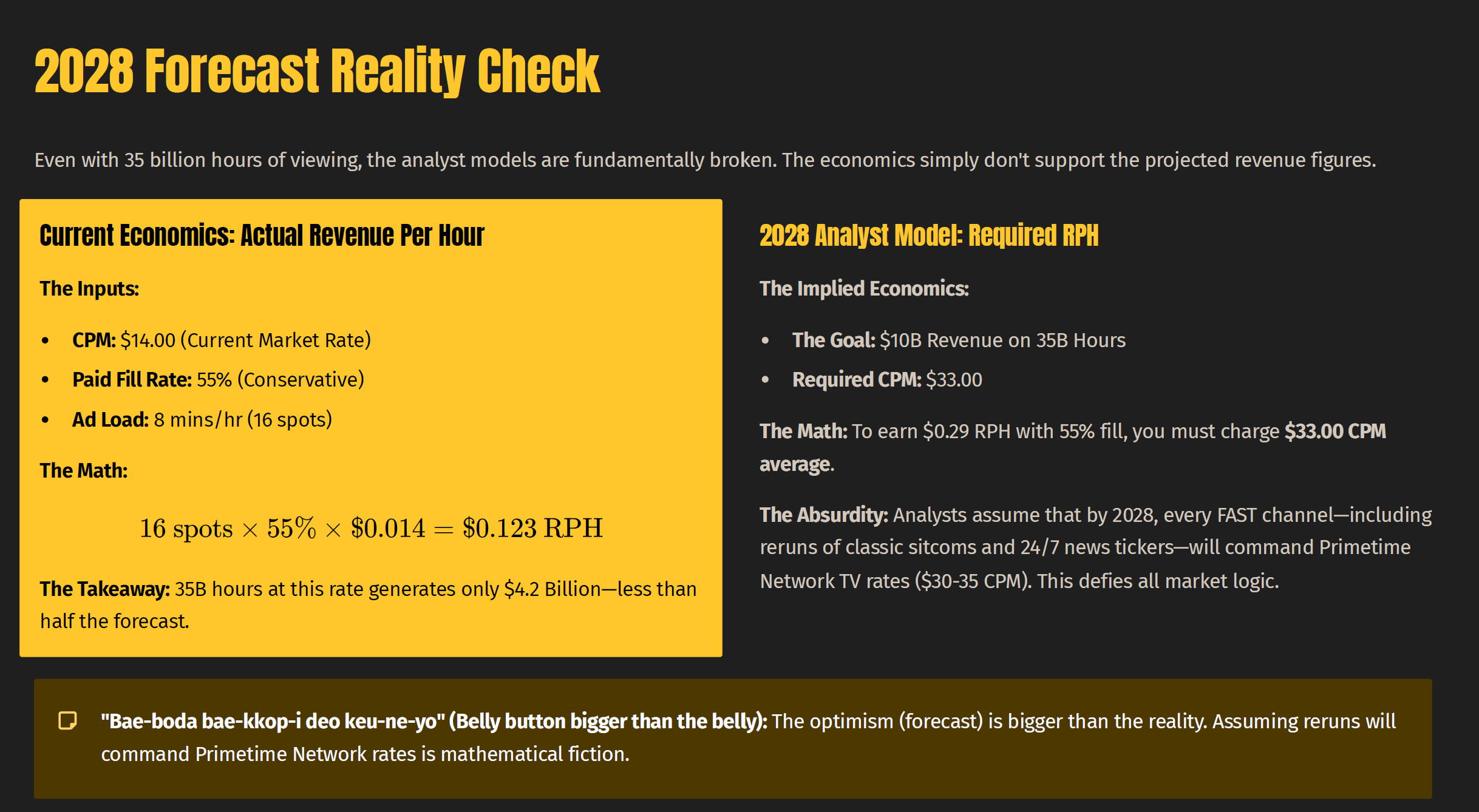 - 단순 수치 비교에서 동일 시간 대비 YouTube 10,000뷰의 광고 수익이 FAST 1,000뷰와 비슷한 수준으로, 결국 **“팬을 TV 화면으로 옮기는 것”**이 전략의 핵심입니다.
