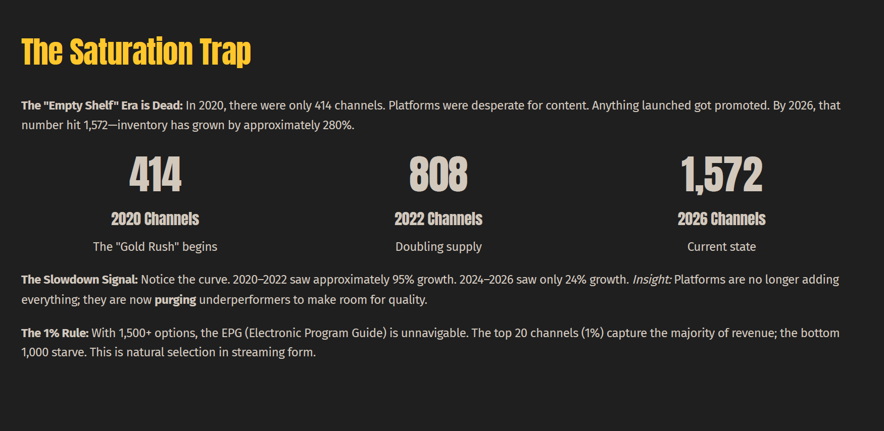 Channel saturation compounds the pressure. The total count of U.S. FAST channels grew from 414 in 2020 to 1,572 by 2026 — a 280% increase. Growth is now decelerating: 95% from 2020 to 2022, falling to just 24% from 2024 to 2026. Platforms are no longer accepting every channel offered; they are actively pruning underperformers. The top 20 channels — roughly 1% of the total — capture 60–70% of all revenue. The bottom thousand starve. This is natural selection, and it is accelerating.