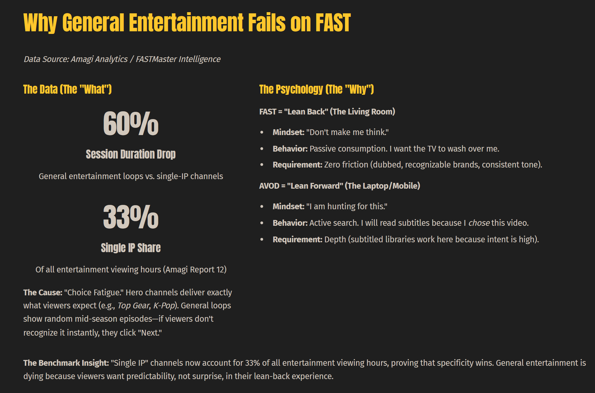 The ad-tech problem is structural, but there is a second and more fundamental barrier: the psychology of the lean-back viewing environment. Amagi's analytics data, covering the full ecosystem of channels they distribute, shows that single-IP channels (dedicated to one property) sustain 60 percentage points more session duration than general entertainment channels, and account for 33% of all entertainment viewing hours — despite comprising far fewer than 33% of available channels. The reason is how people watch TV.
