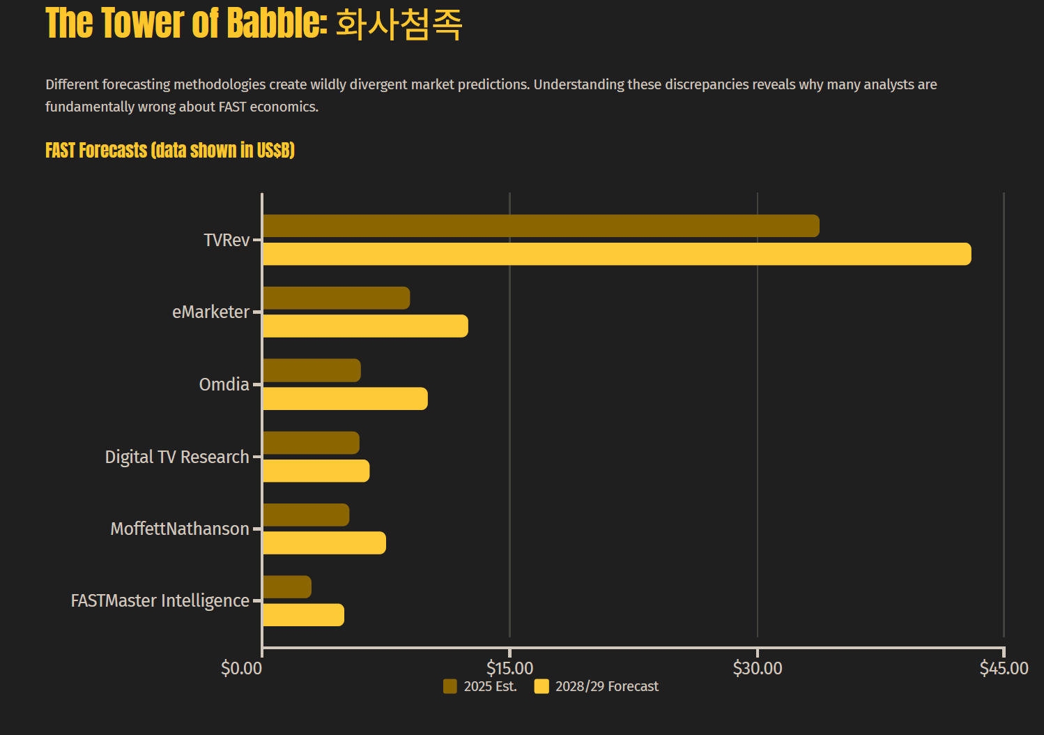 Bridge opened his analysis with a Korean proverb — 화사첨족 (hwasa-cheomjok, "drawing feet on a snake") — applied to the FAST analyst community. A bewildering range of forecasts exists: TVRev and others project the U.S. FAST market reaching $10 billion or more by 2028–29. FASTMaster Intelligence puts the realistic figure at $4.2–6 billion. The gap is not accidental; it reflects a fundamental methodological choice about what gets counted as FAST revenue.