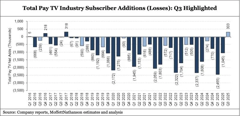 MoffettNathanson가 발간한 ‘코드커팅 모니터 Q3 2025’에 따르면, 유튜브 TV(YouTube TV) 등 가상 MVPD(vMVPD)를 포함한 미국 전체 유료 TV 시장은 2025년 3분기에 약 30만 3,000명의 순가입자(Net Adds)를 기록했다.