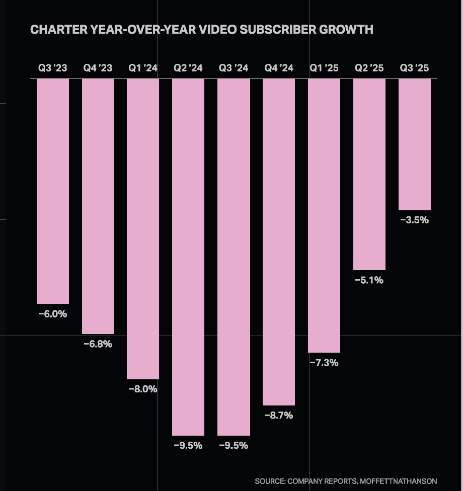 그 결과 차터의 유료 방송(Video) 가입자 감소폭은 극적으로 줄었다. 1년 전 같은 분기 약 29만 4,000명(또는 28만 명 수준)까지 확대됐던 비디오 순이탈은, 2025년 3분기 6만~7만 명대 손실로 축소되며 약 70% 이상 개선됐다. 회사가 공시한 수치 역시 2025년 2분기 비디오 고객 감소가 40만 명대에서 8만 명 수준으로 줄었고, 3분기에는 6만 4,000명 감소에 그쳤음을 확인시켜준다.