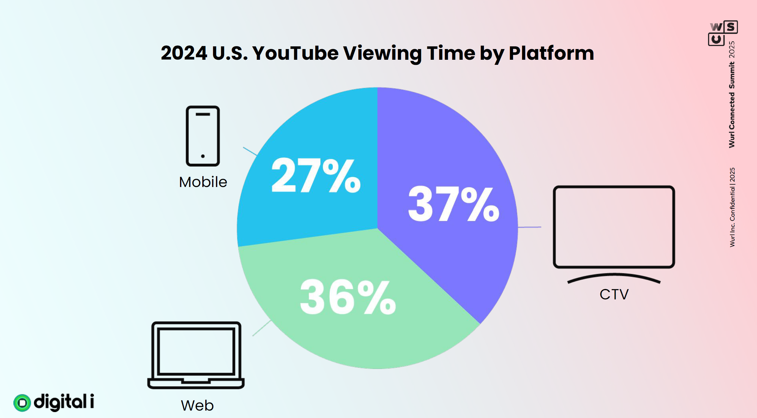 - 2024 US YouTube viewing platform distribution: CTV 37%, Web 36%, Mobile 27%