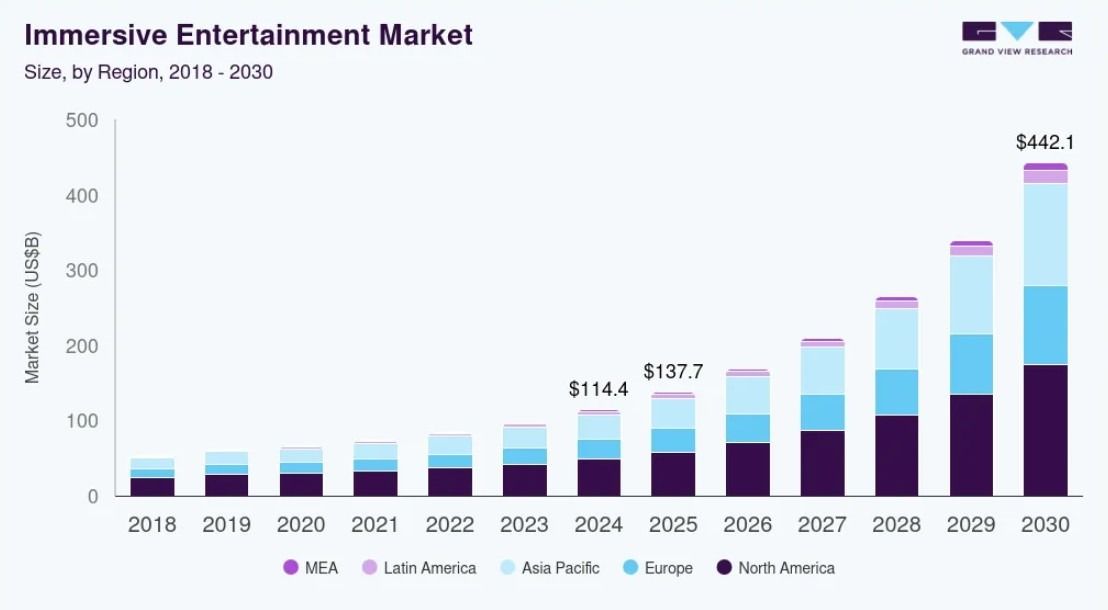 지역별로 보면 2024년 기준 북미가 여전히 가장 큰 비중을 차지하지만, 아시아·태평양이 2025~2030년 동안 가장 빠른 성장률을 기록할 것으로 예상된다. 이는 한국을 포함한 아시아권에서 몰입형 콘텐츠와 전용 시설에 대한 투자와 정책 지원이 구조적으로 확대될 수 있는 시장 환경이 이미 형성되고 있음을 시사한다.