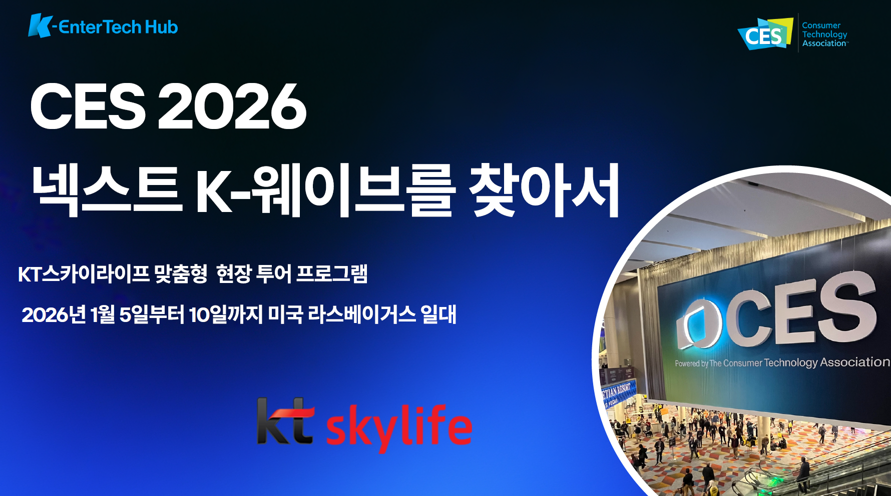 KT스카이라이프 전용 CES2026투어. AI,미디어, 엔터테인먼트, 이머시브의 미래 논의. 주요 컨퍼런스 요약, 자료집, 단독 필드 투어 제공