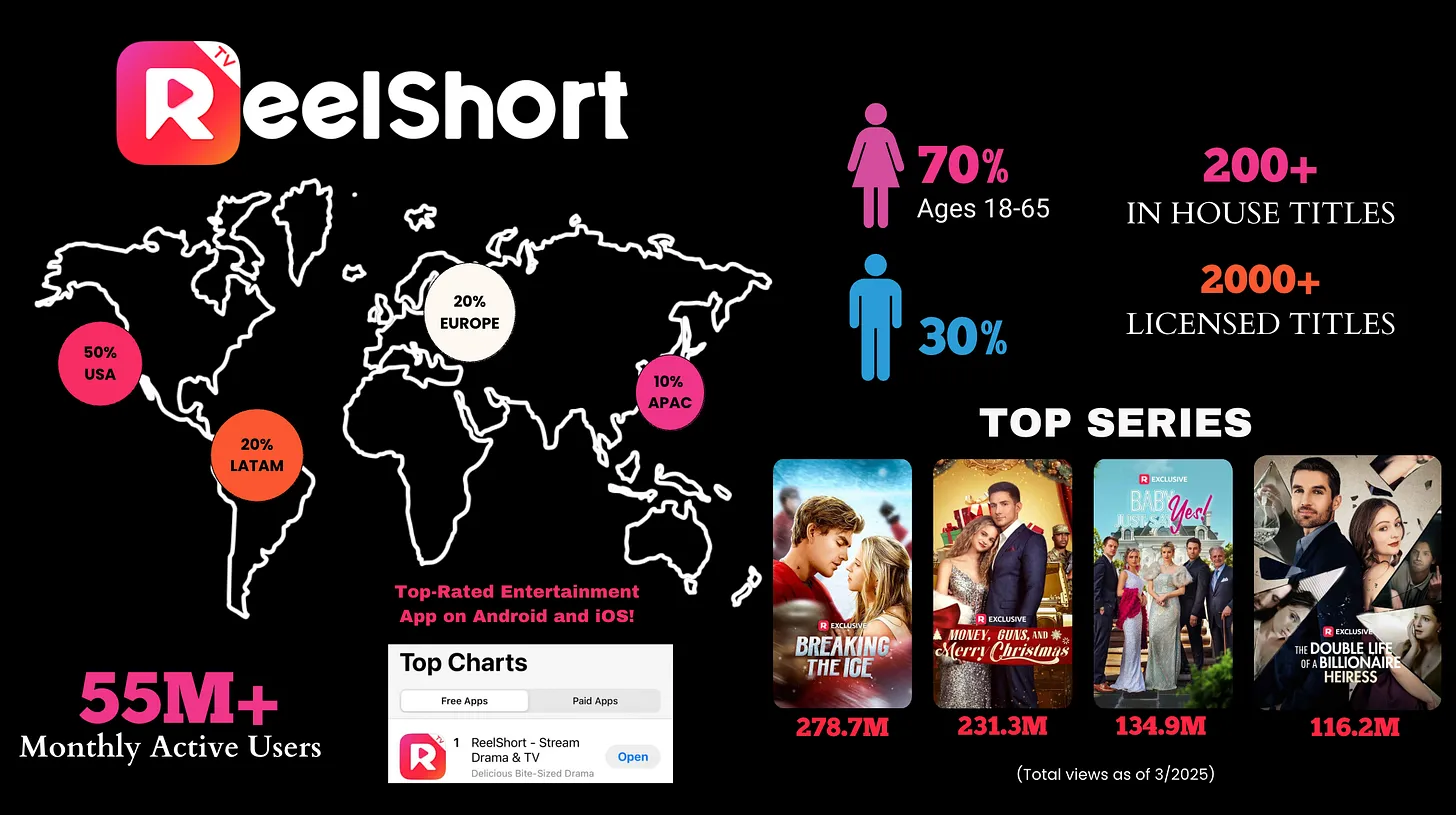 두 개의 플랫폼이 시장을 지배한다: DramaBox와 ReelShort. Media Partners Asia에 따르면 DramaBox는 수익성 달성이 가능함을 입증했다. 2024년 3억 2,300만 달러 매출에 1,000만 달러 순이익을 기록했다. 구독, 에피소드별 잠금 해제, 광고를 결합한 모델이다. 반면 ReelShort는 약 4억 달러로 더 큰 규모를 달성했지만, 막대한 마케팅 비용과 상각으로 인해 여전히 적자 상태다.