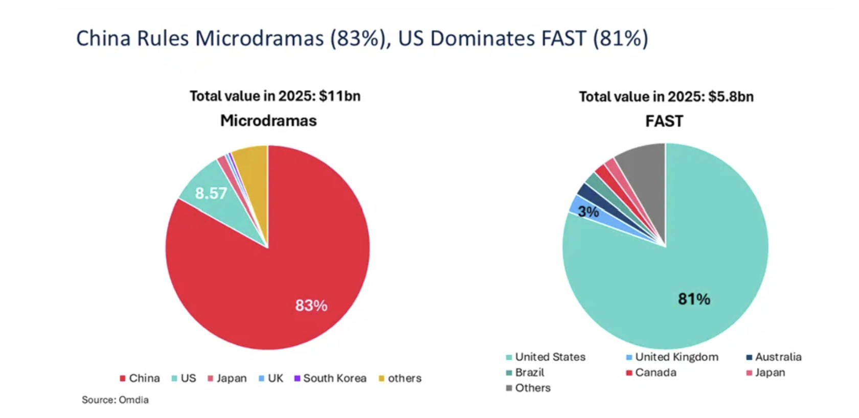 옴디아에 따르면 글로벌 마이크로드라마 시장 규모는 110억 달러(지난해 말)에 달한다. 최근 급격히 점유율을 확대하고 있는 무료 광고 기반 스트리밍 TV(FAST)의 두 배(58억 달러)규모다. FAST는 미국이 시장을 지배하고 있지만 마이크로 드라마의 텃밭은 중국이다. 시장 점유율이 83퍼센트에 달한다.