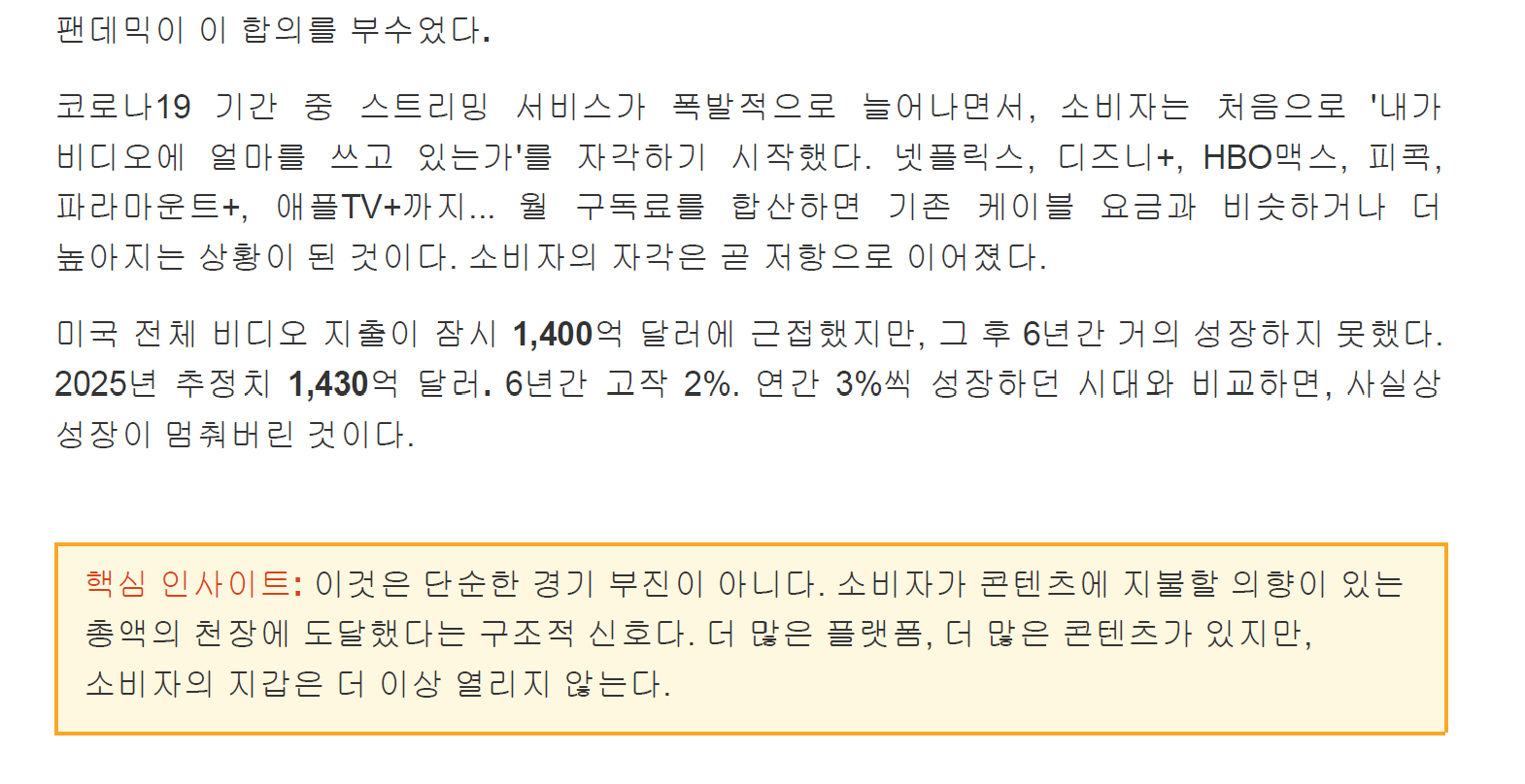 미국 비디오 시장의 ‘지출 천장’과 SVOD 정체, FAST·슈퍼팬 중심으로 재편되는 새 룰 위에서 K-콘텐츠가 취해야 할 여섯 가지 실행 전략을 정리한 딥다이브 보고서