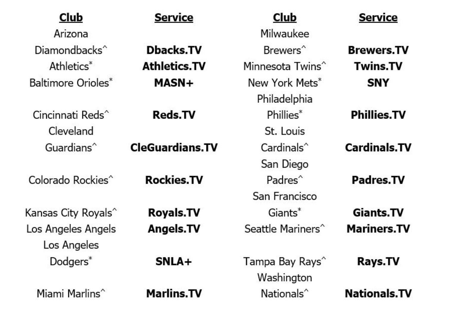 [2026 시즌 MLB 팀별 DTC 스트리밍 서비스 현황. ^는 MLB 로컬 미디어 제작, *는 RSN 파트너십 유지 팀]