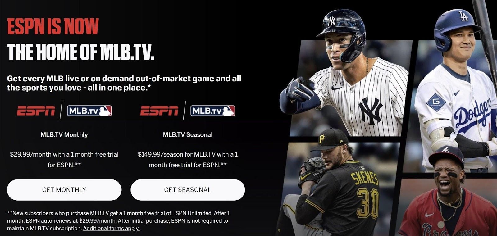 첫째, ESPN은 MLB.TV의 독점 권리 보유자로서 매 시즌 수천 경기의 아웃오브마켓(타지역) 중계를 ESPN 앱을 통해 제공한다. 신규 가입자는 ESPN을 통해 구매해야 하며, MLB.TV 구매 시 ESPN 언리미티드(ESPN Unlimited) 1개월 무료 체험이 포함된다.