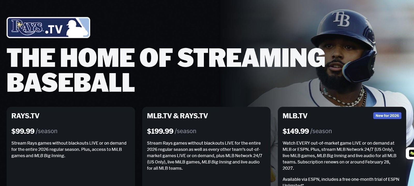 [Rays.TV 가격 페이지: 팀별 $99.99/시즌, 번들 $199.99/시즌, MLB.TV 단독 $149.99/시즌 (New for 2026)]