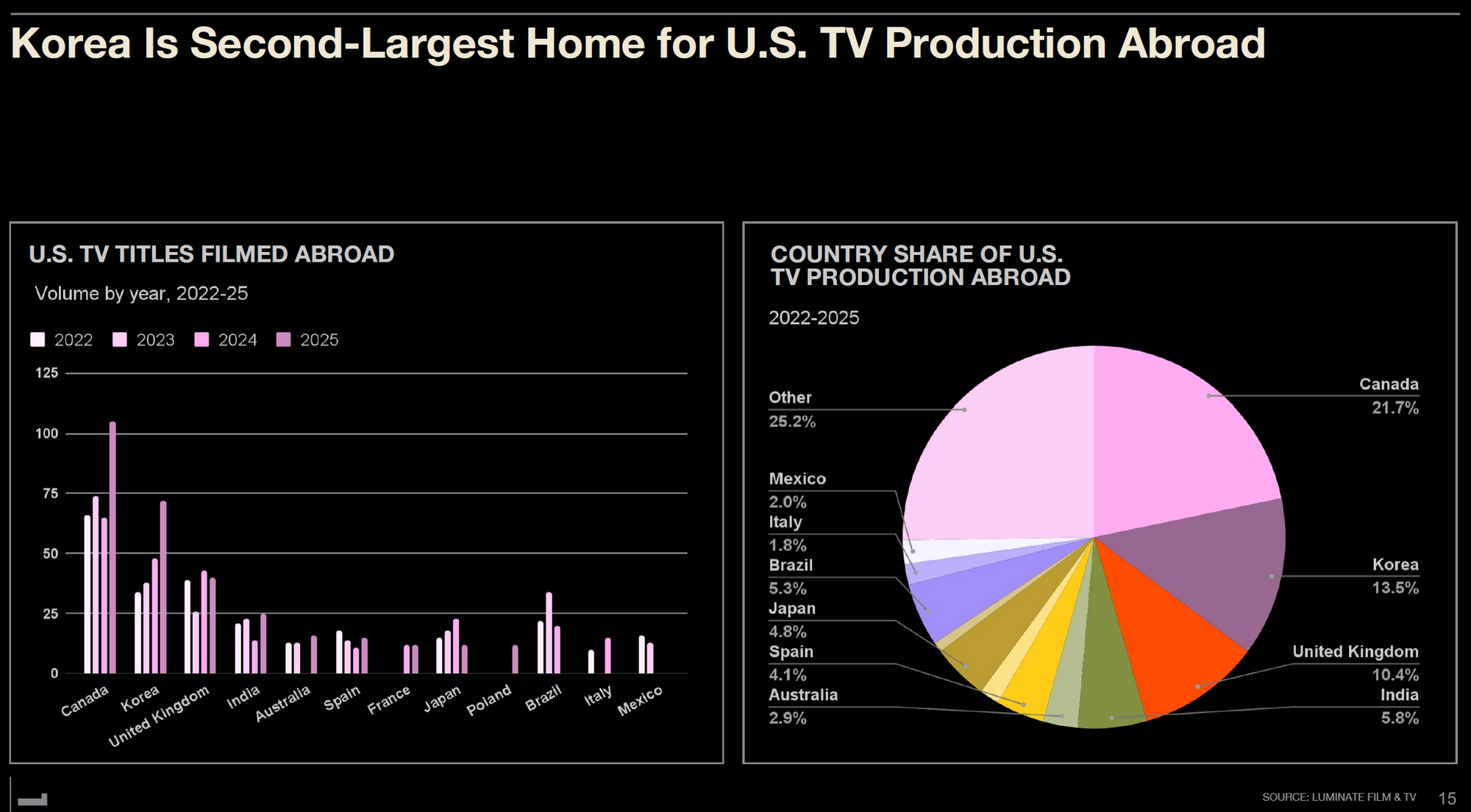 According to the Global Entertainment Trend Report by Luminate released during MIPCOM, South Korea ranked second (13.5%) among overseas shooting locations for American TV productions, following Canada (21.7%). This puts Korea ahead of the U.K. (10.4%) and India (5.8%), making it the largest base in Asia. Between 2022 and 2025, the number of U.S. TV titles filmed in Korea has shown steady growth.