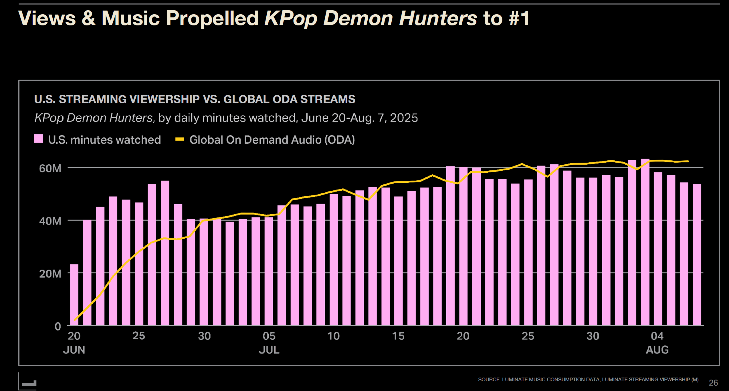 A new model of K-content success came through KPop Demon Hunters, a Netflix animated film that drew over 2 million viewing minutes in its opening week and sustained top-tier performance for nine consecutive weeks. The title’s demographic balance—31% under 18, 54% female, 46% male—showed a powerful crossover between K-pop fandom and animation audiences.