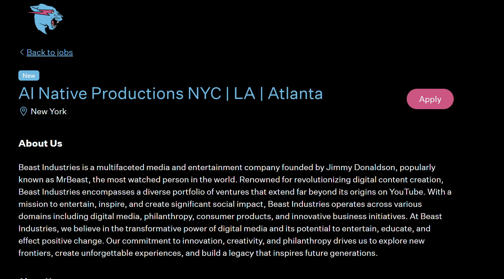 도날드슨(Donaldson)이 이끄는 비스트 인더스트리(Beast Industries)는 최근 직원 채용 공고를 통해 "AI가 도구가 아닌 토대(foundation)인" 신규 제작 역량을 구축하겠다고 명시했다.