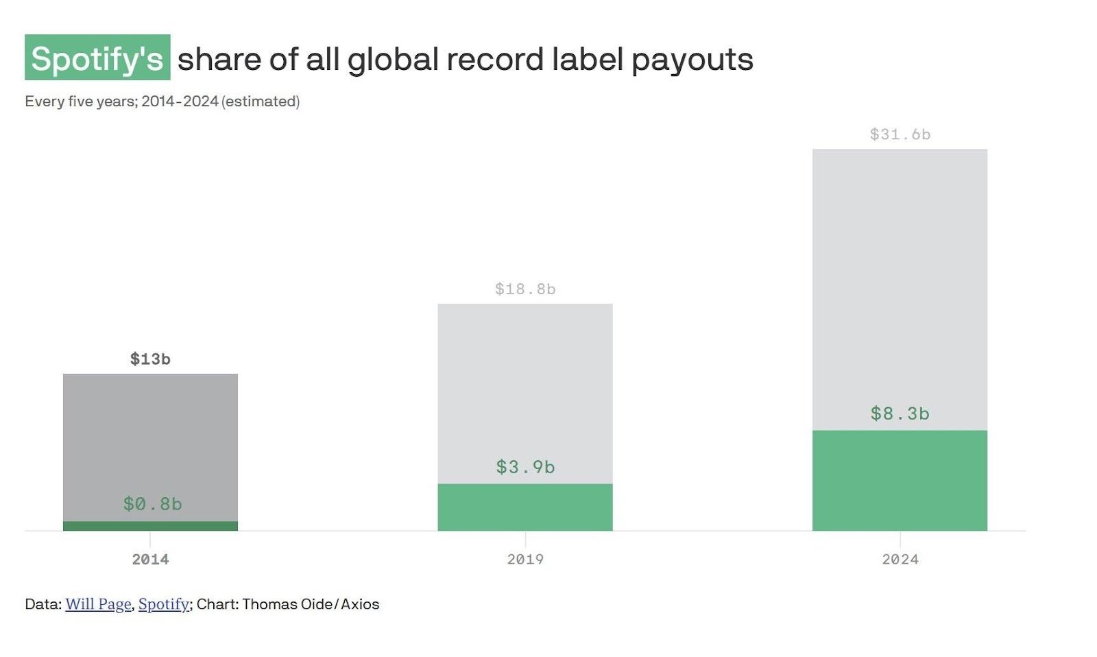Music economist Will Page credits Spotify alone for over 40% of the global growth in record label revenue between 2014 and 2024.