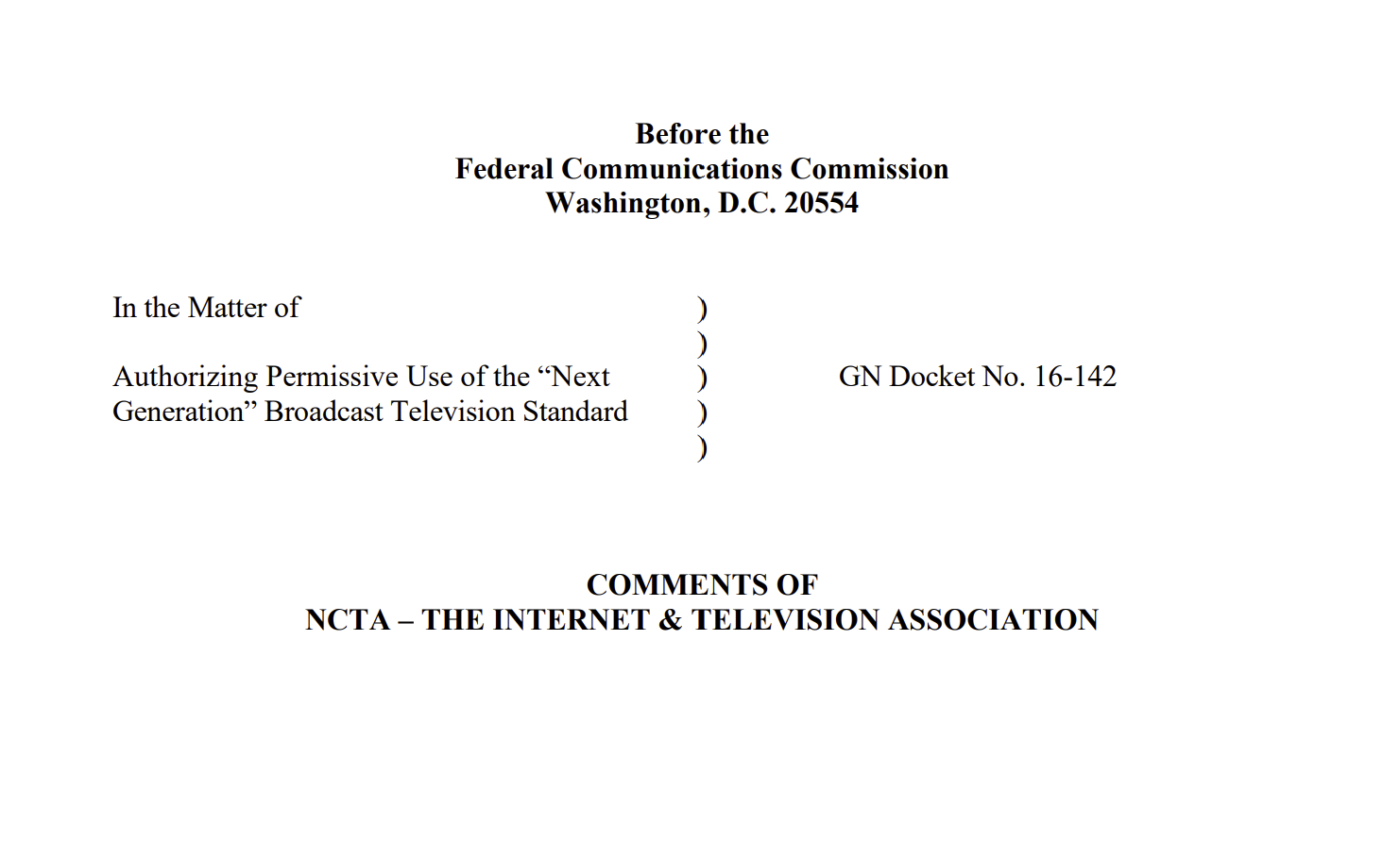 NCTA는 1월 20일 FCC에 제출한 의견서(GN Docket No. 16-142)에서 "3.0 신호에 대한 의무전송 요건은 케이블 사업자들에게 상당한 부담을 부과하며, 이는 수정헌법 제1조와 제5조를 위반하는 것"이라고 명시했다.