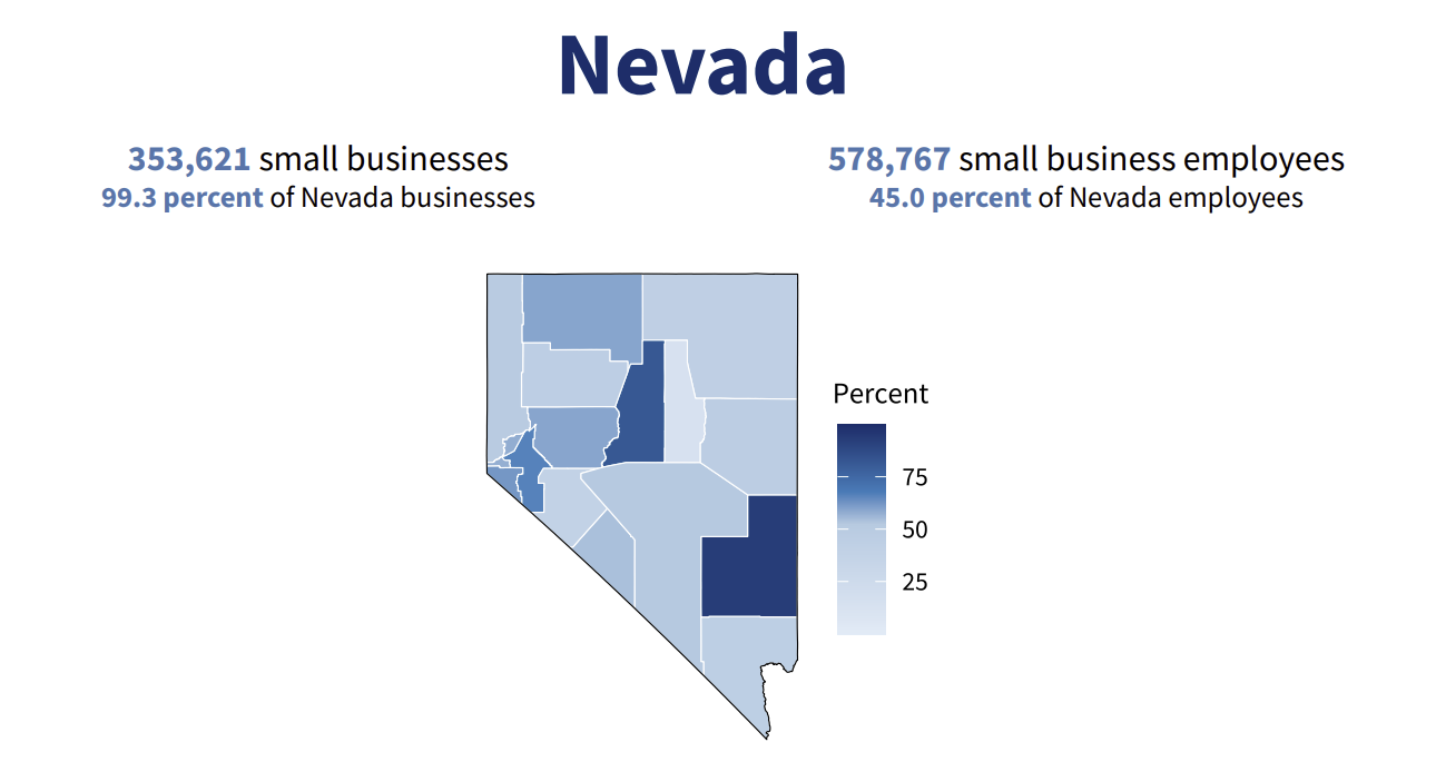 네바다 경제청에 따르면 중소기업은 네바다 경제에서 중요한 역할을 담당하고 있으며 주 전체 기업의 99%를 차지한다. UNLV 비즈니스경제연구센터의 2024년 자료에 따르면, 네바다주에서 직원을 고용하고 운영 중인 기업의 40%가 코로나19 팬데믹 이후에 설립됐다. 2022년 기준, 직원 1~500명 규모의 중소기업이 주 전체 민간 고용의 45%를 차지하며, 이는 팬데믹 이전 42%에서 증가한 수치다.
