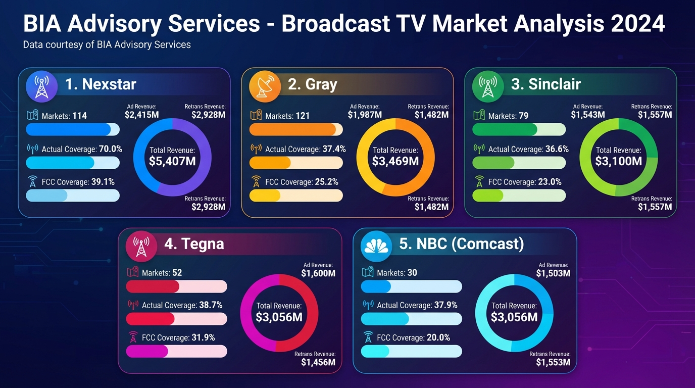 If Nexstar Media Group's $6.2 billion acquisition of TEGNA is completed, it will create the largest broadcast group in U.S. history, owning 265 stations nationwide. Under FCC calculation methods, this combined entity would potentially reach 54.5% of all U.S. TV households.