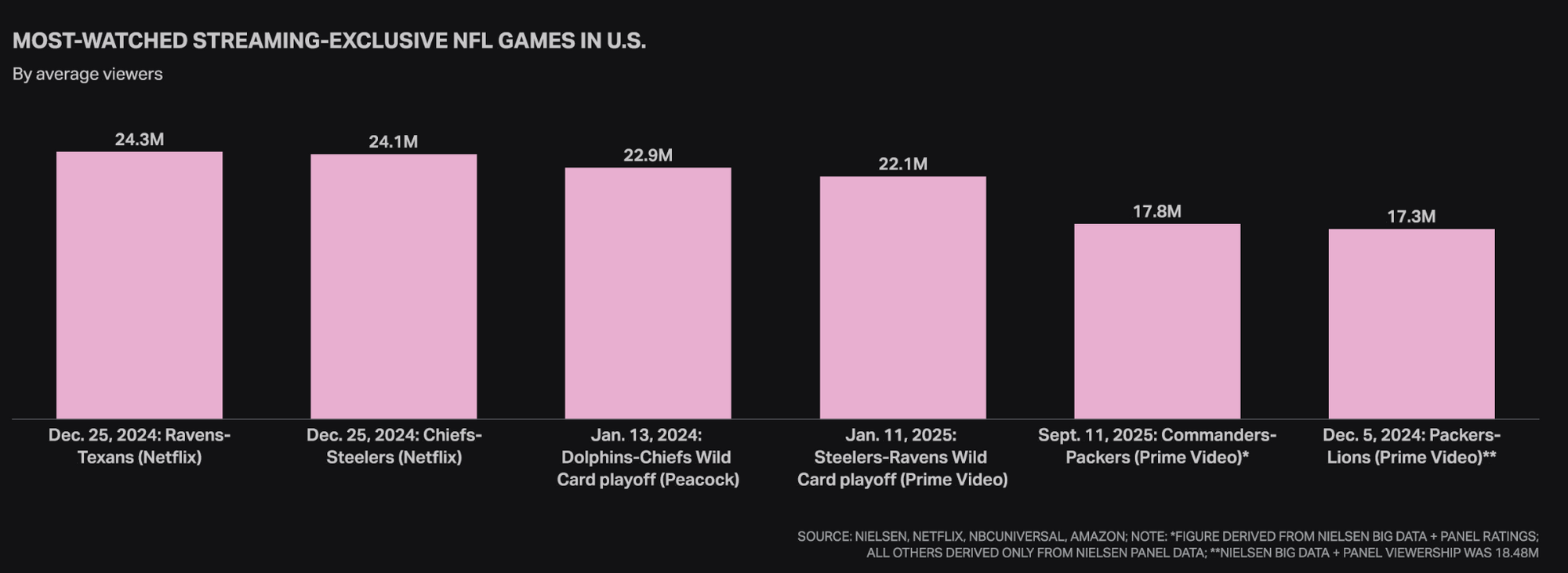실제 넷플릭스는 미디어 전문가들의 예측대로 갔다. 넷플릭스는 주요 리그의 전체 시즌 중계권(full-season rights)을 추구하기보다는 라이브 경기를 중계하는 방식으로 스포츠 시장에 들어왔다. 이 전략은 효과를 보고 있다. 제이크 폴 vs 마이크 타이슨(Jake Paul vs. Mike Tyson) 격투기와 NFL 경기 같은 이벤트들이 수백만 명의 신규 구독 가입을 이끌어냈다.