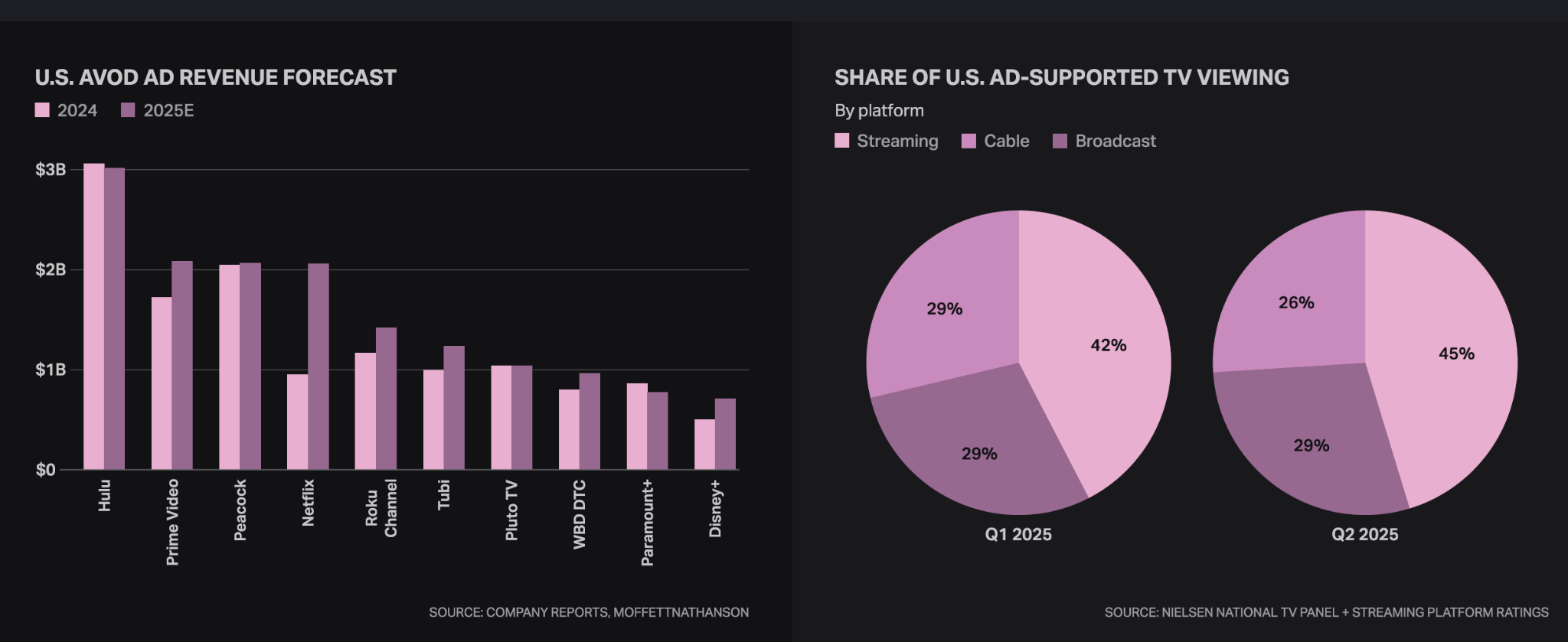 미국 AVOD 시장에서 여전히 Hulu(약 30억 달러), Prime Video·Peacock(각각 약 20억 달러대)이 상위권을 형성하고 있지만, 넷플릭스는 론칭 2~3년 만에 Tubi, Pluto TV, WBD DTC, Paramount+, Disney+ 등과 비슷한 규모의 광고 매출을 올리는 ‘중위권 플랫폼’으로 포지셔닝되는 그림이다.