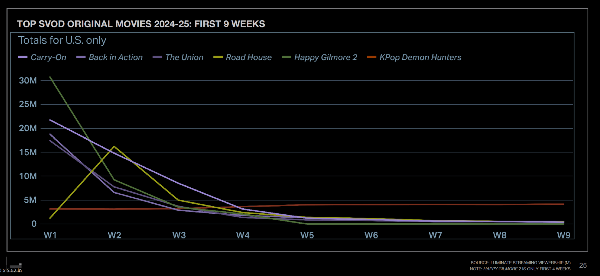 넷플릭스는 WBD의 방대한 프랜차이즈 IP와 슈퍼팬 기반이 시청 시간을 끌어올리고 ‘프랜차이즈 빈곤’을 완화하는 데 기여할 수 있다고 기대한다. 그 효과가 어느 정도일지는 검증하기 어렵다. 이 지점에서 K팝 데몬 헌터스와 같은 K콘텐츠의 롱테일 성과는 중요한 실험 케이스로 거론된다. 루미네이트 분석에 따르면 이 작품은 북미를 포함한 글로벌 시장에서 개봉 초반보다 이후 주차에 수요가 길게 이어지는 패턴을 보였다. K-팝·K-드라마 팬덤이 입소문과 커뮤니티를 통해 장기 소비를 만들어낼 수 있음을 시사하는 것이다.