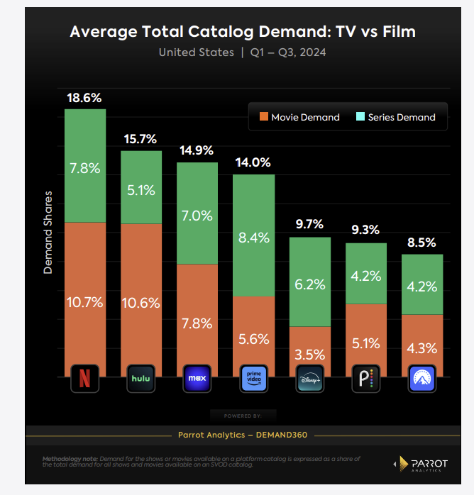 Netflix's influence in the film market continues to grow. According to Parrot Analytics, Netflix films commanded a 10.8% demand share as of December 2024. While this measures demand within Netflix's content library, demand on a platform with over 300 million subscribers effectively represents the broader market.