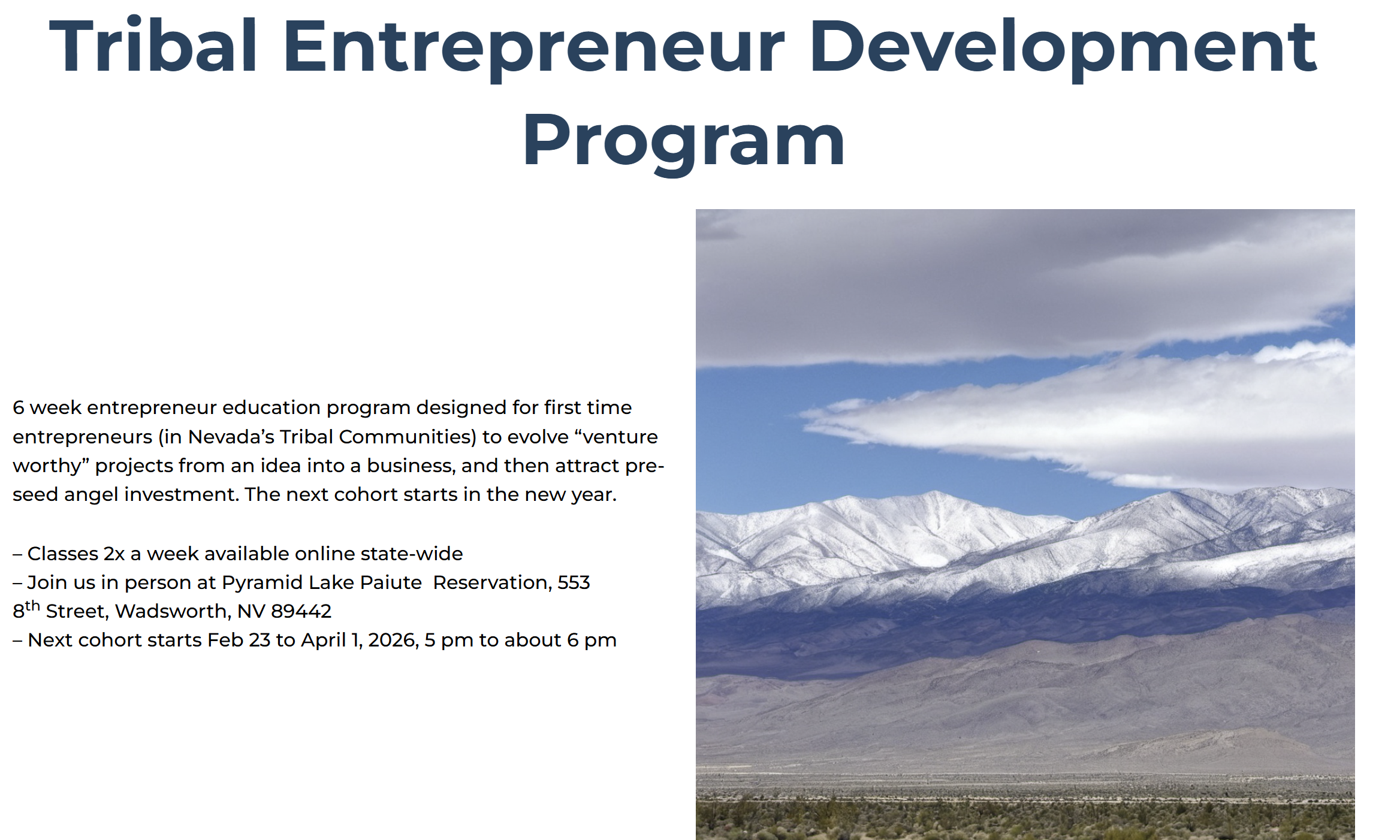 The Nevada Governor's Office of Economic Development (GOED) has opened registration for the Tribal Entrepreneur Development Program, a free six-week course designed to help first-time entrepreneurs in Nevada's tribal communities turn ideas into successful businesses.