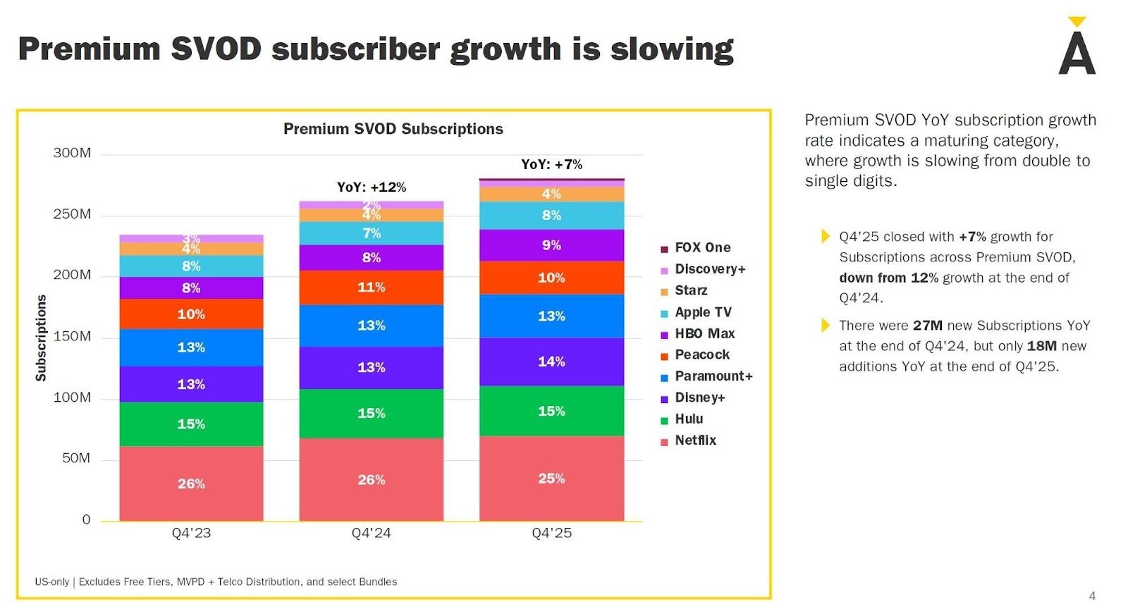 ▲ 미국 프리미엄 SVOD 구독자 추이 (Q4'23~Q4'25) / 출처: Ampere Analysis (무료 티어·MVPD·통신사 번들 제외)