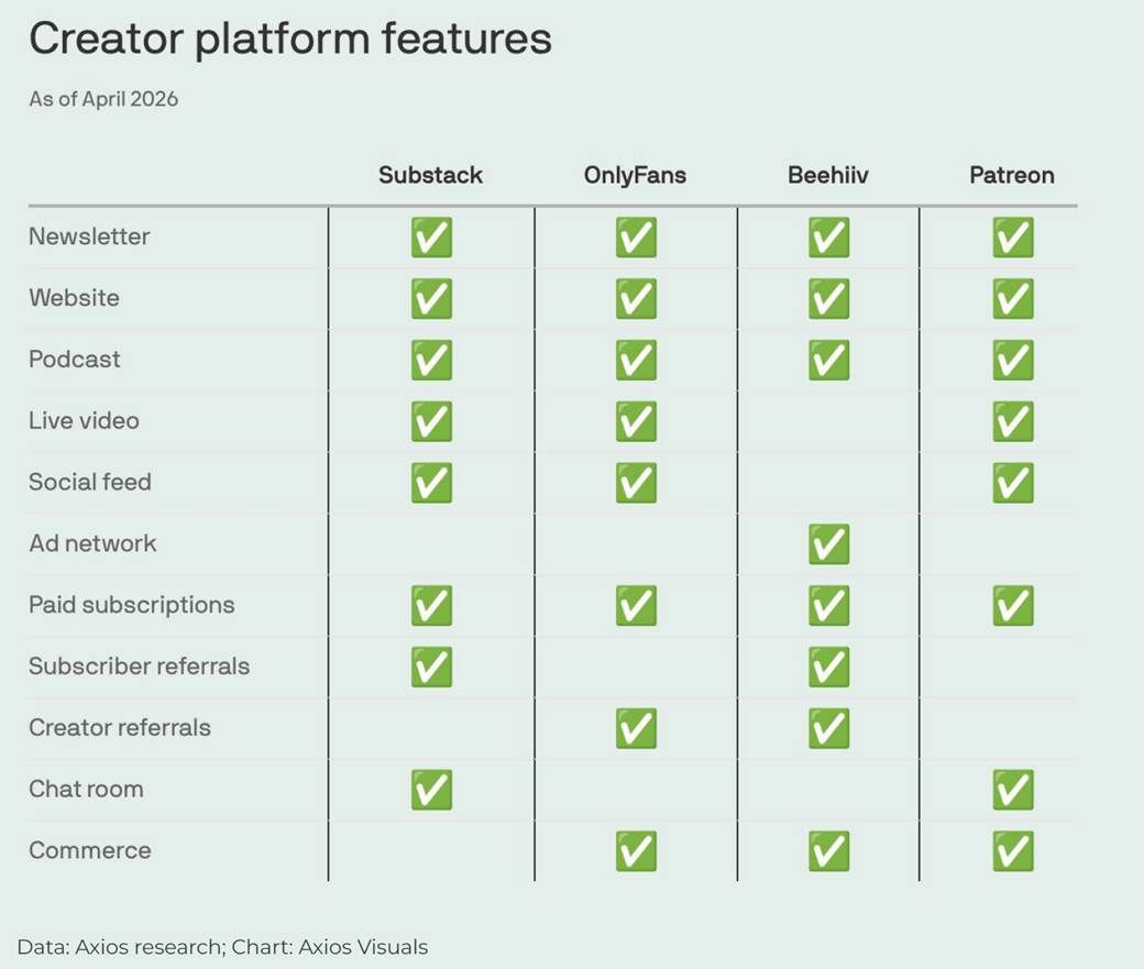 ▲ 크리에이터 플랫폼 주요 기능 비교(2026년 4월 기준). / 자료: 악시오스(Axios) 리서치·Axios Visuals